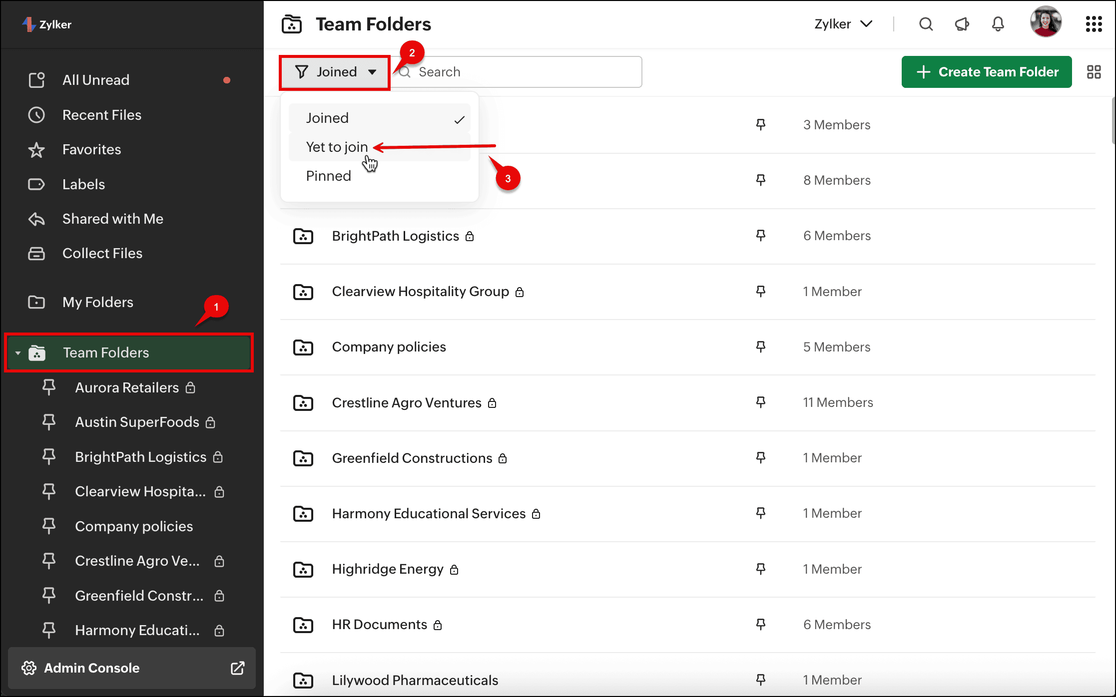 Note: When you join a public Team Folder, you are automatically assigned the Viewer role. If you require a higher level of access (like Editor or Admin), please contact the Team Folder Admin or Organizer and request a role change.Learn how to use the best tools for sales force automation and better customer engagement from Zoho's implementation specialists.