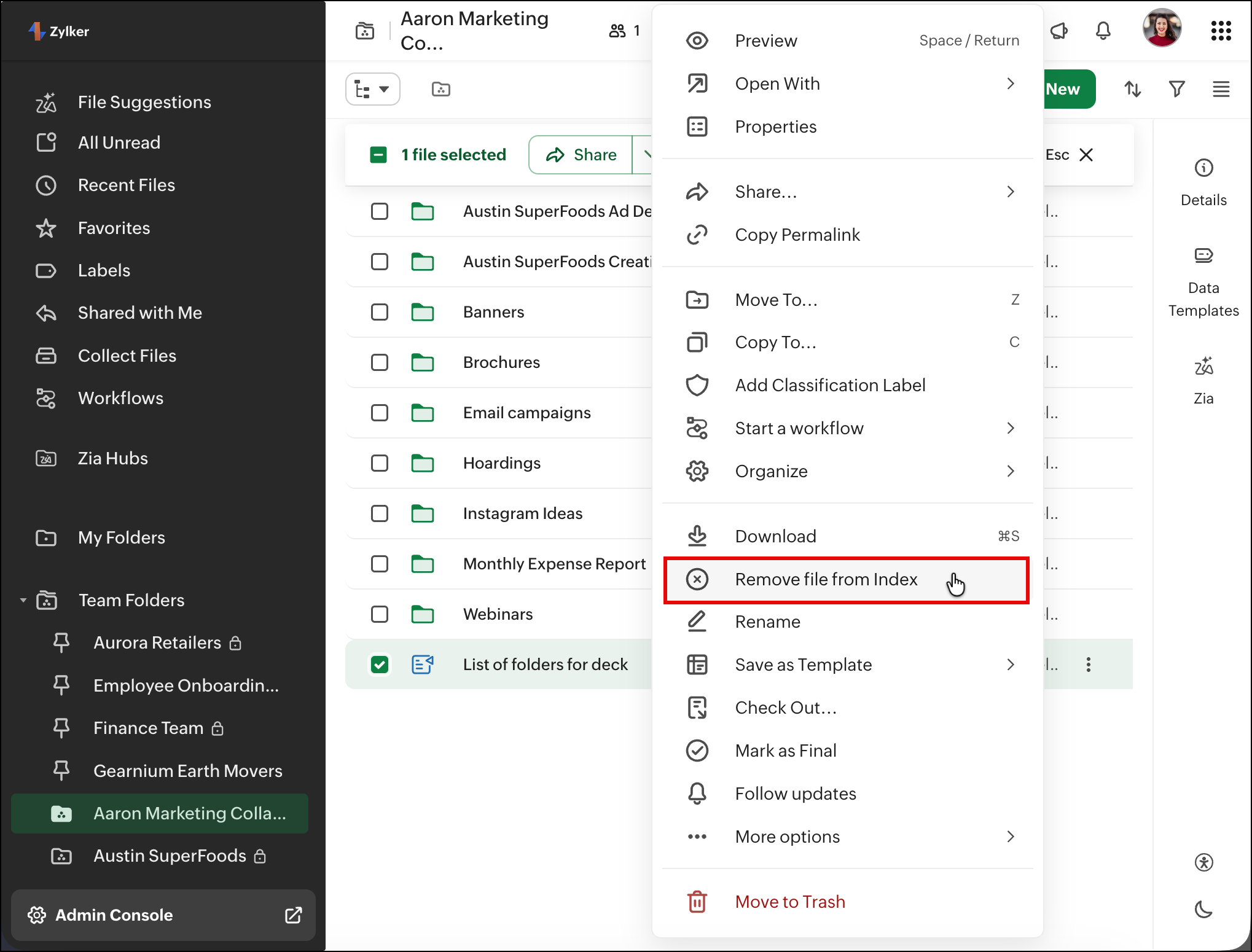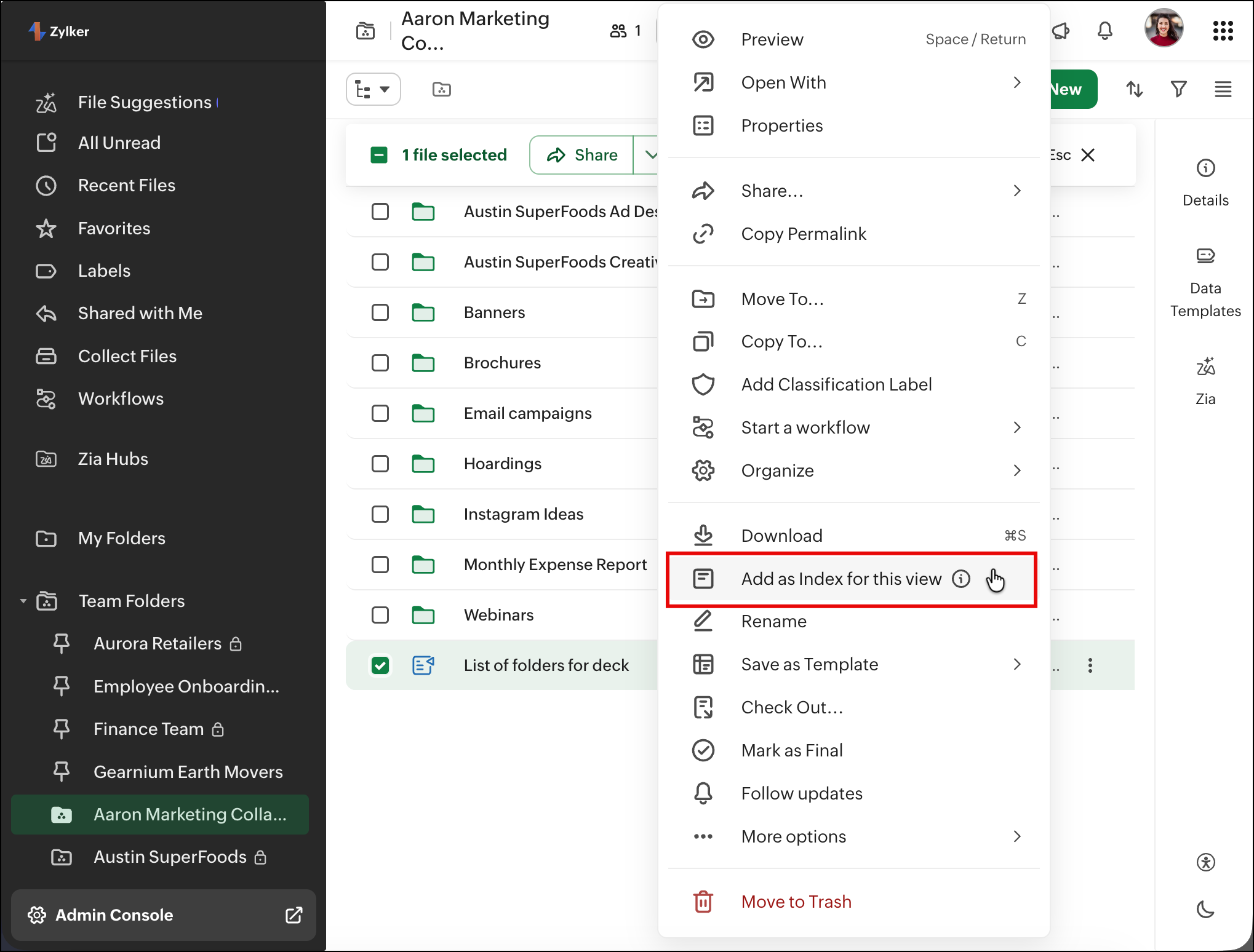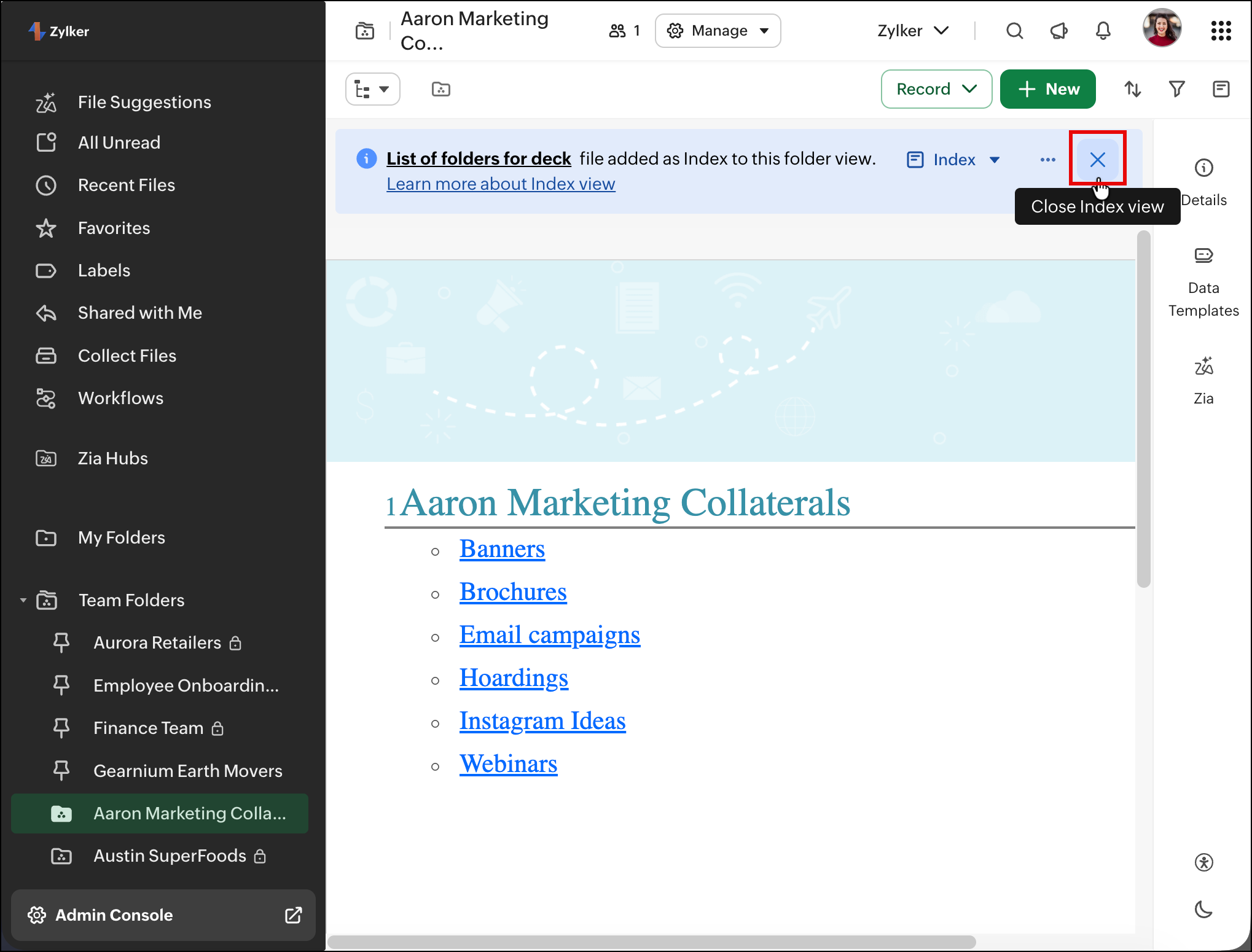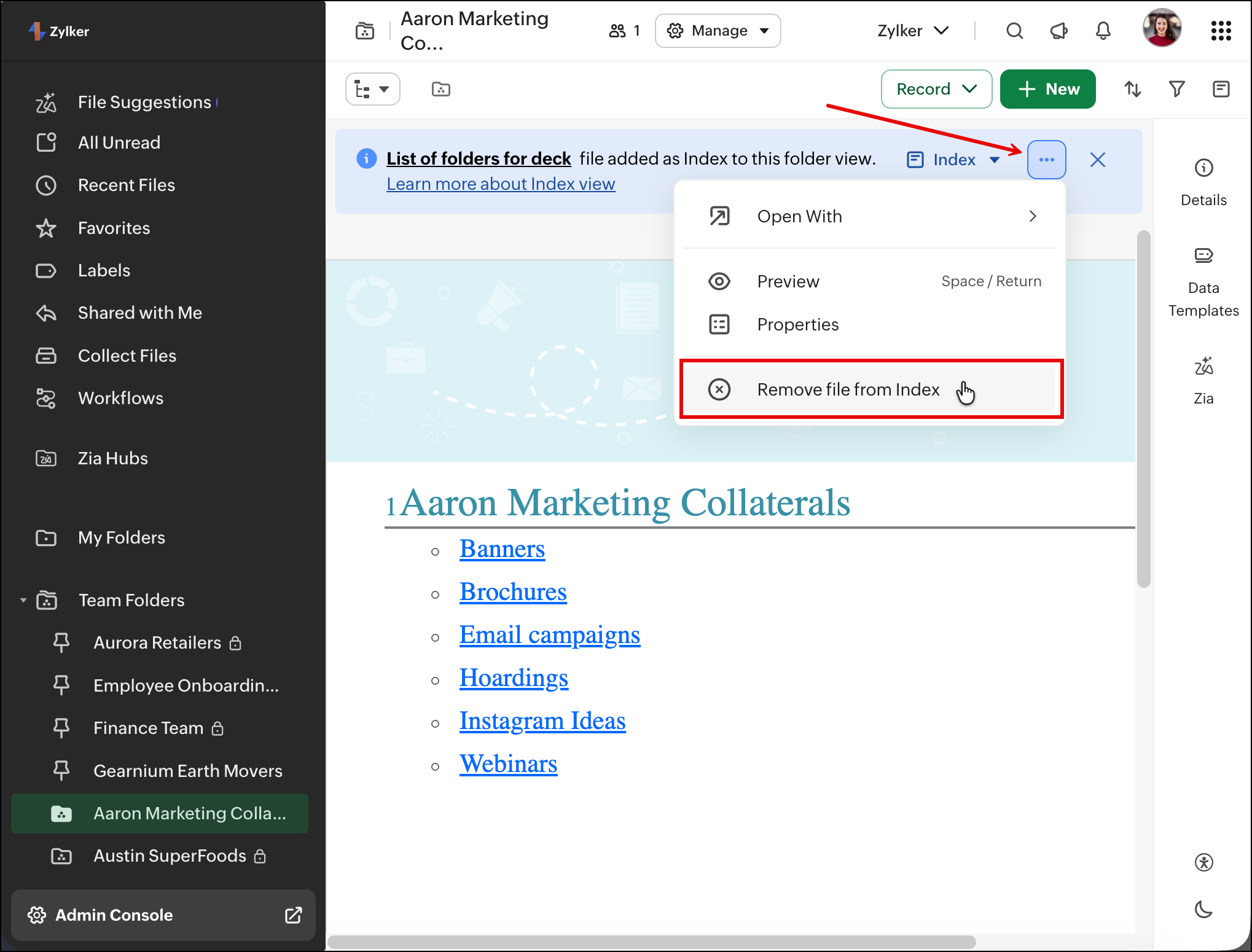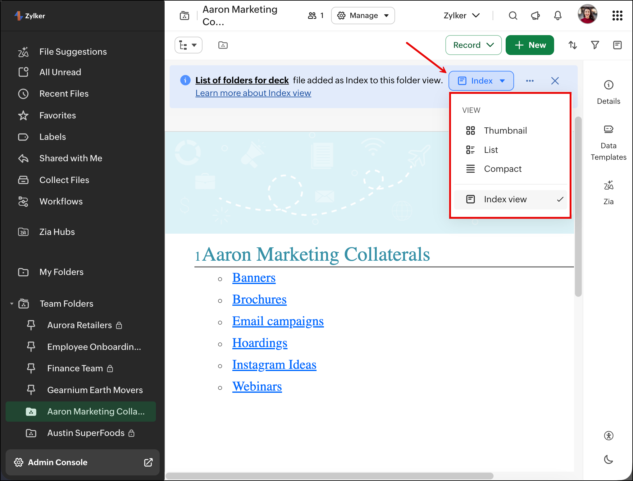 The Index view helps you structure and navigate folder content more effectively by using a Zoho Writer file as a central reference point. You can curate important links, resources, and sections in a single document and set it as the folder’s index, making it easier for users to find what they need without browsing through multiple files.