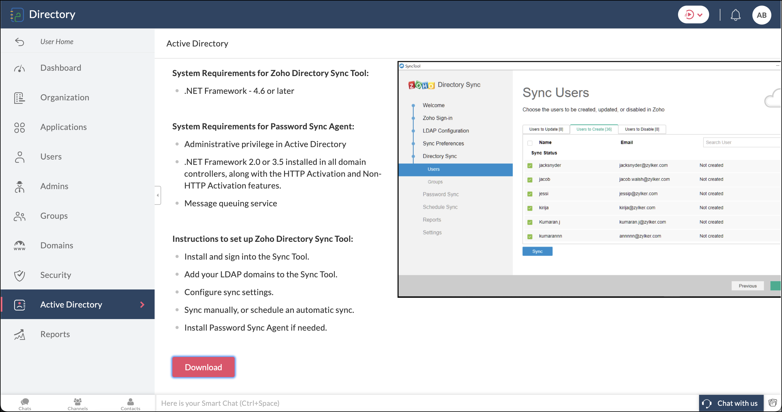 You can download the Zoho Directory Sync tool from the Active Directory tab in the left pane. To install the tool on your device, open the downloaded file and follow the setup process.