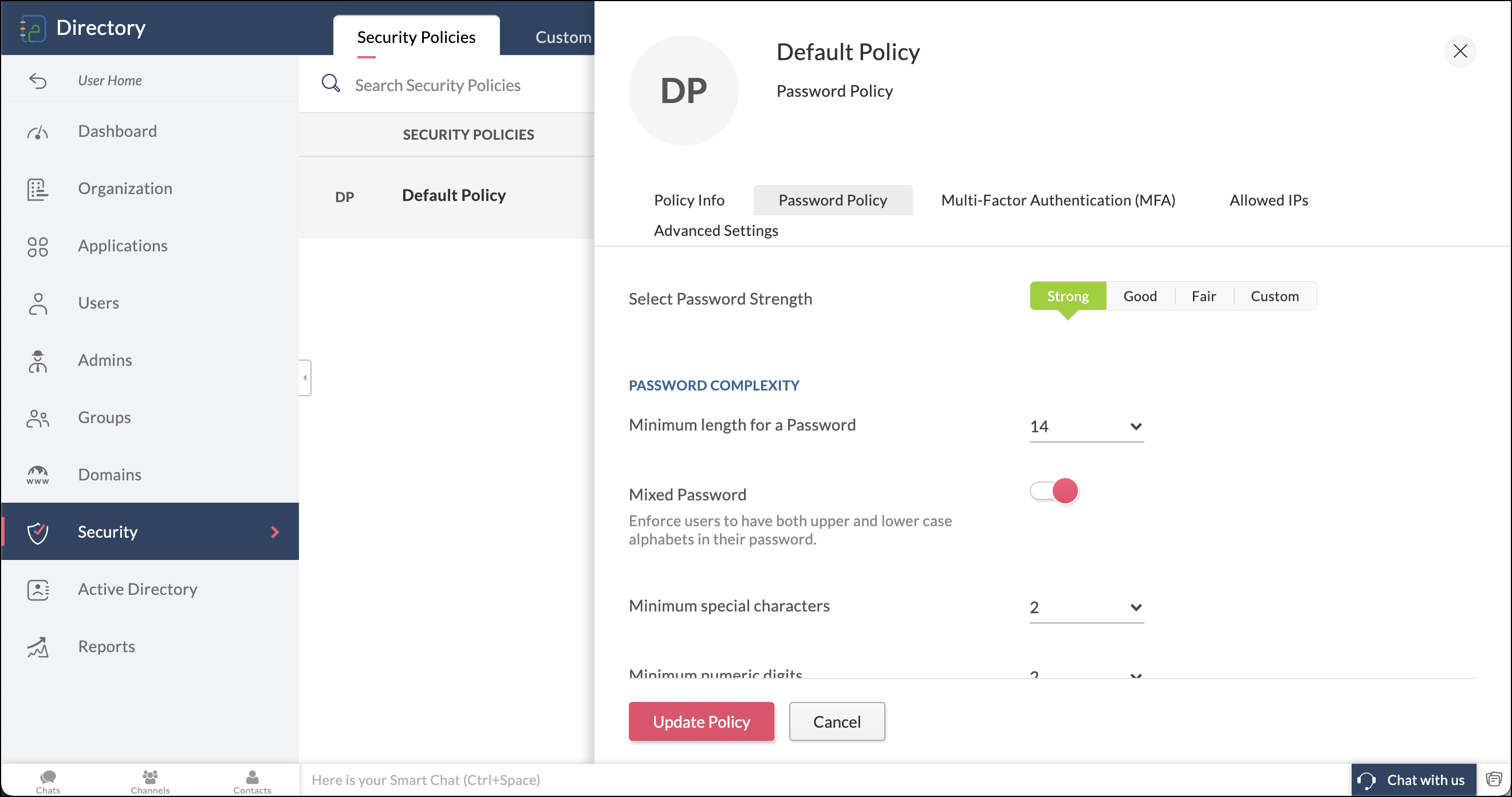 3. Only the Default policy applies to users with a free subscription. Zoho Directory users with a paid subscription or customers who have paid for any Zoho app have the option to set up and customize security policies according to their needs.