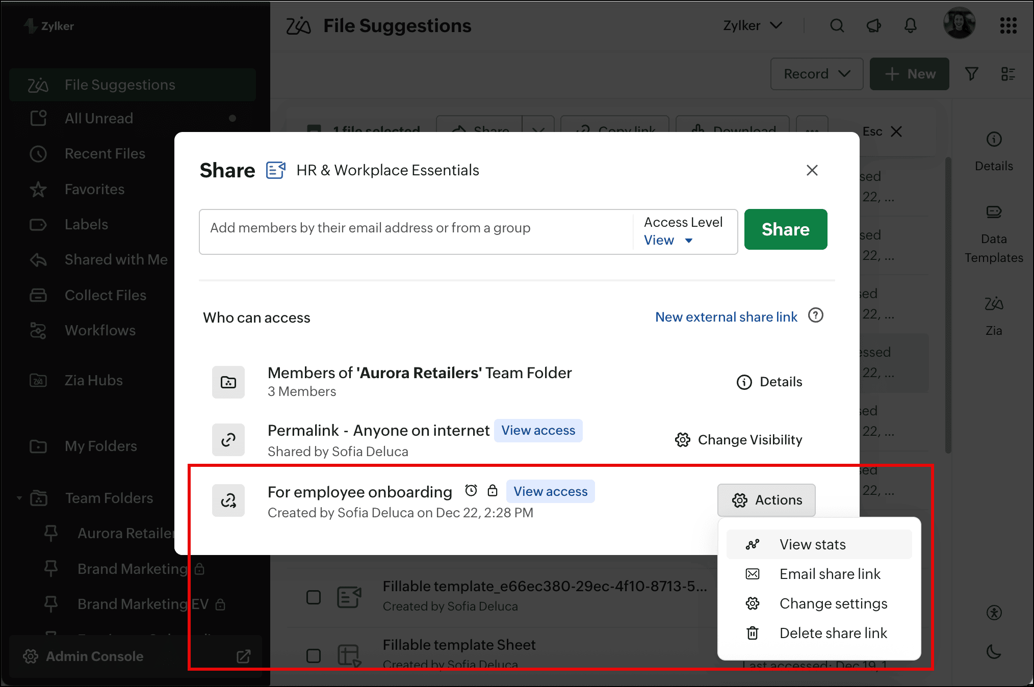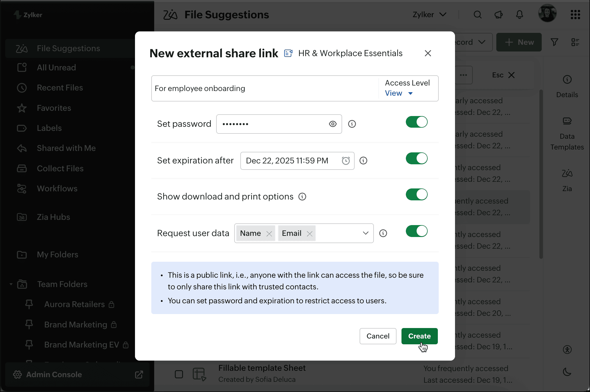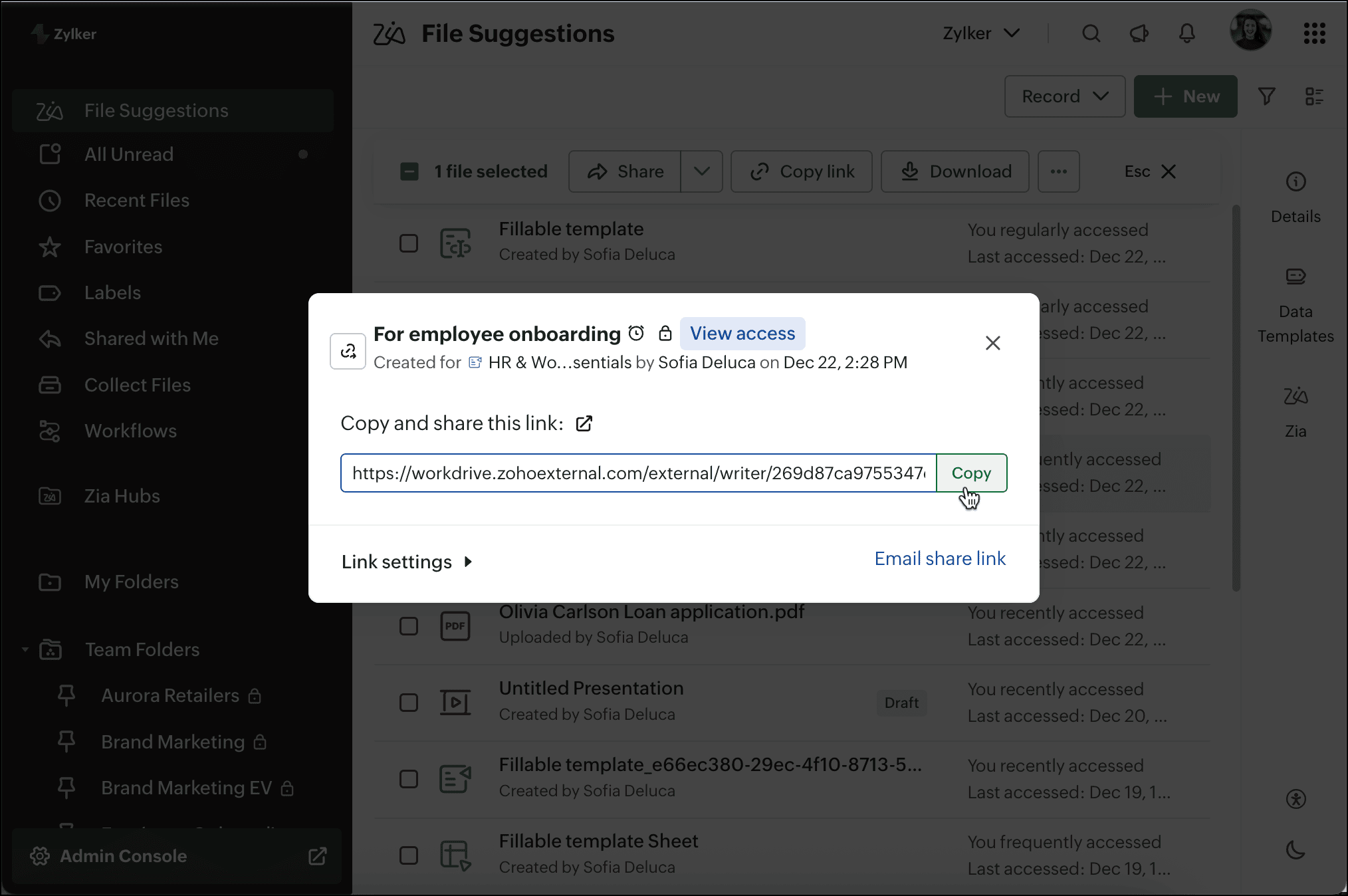 - Upload files (file upload limit will apply based on the WorkDrive plan)