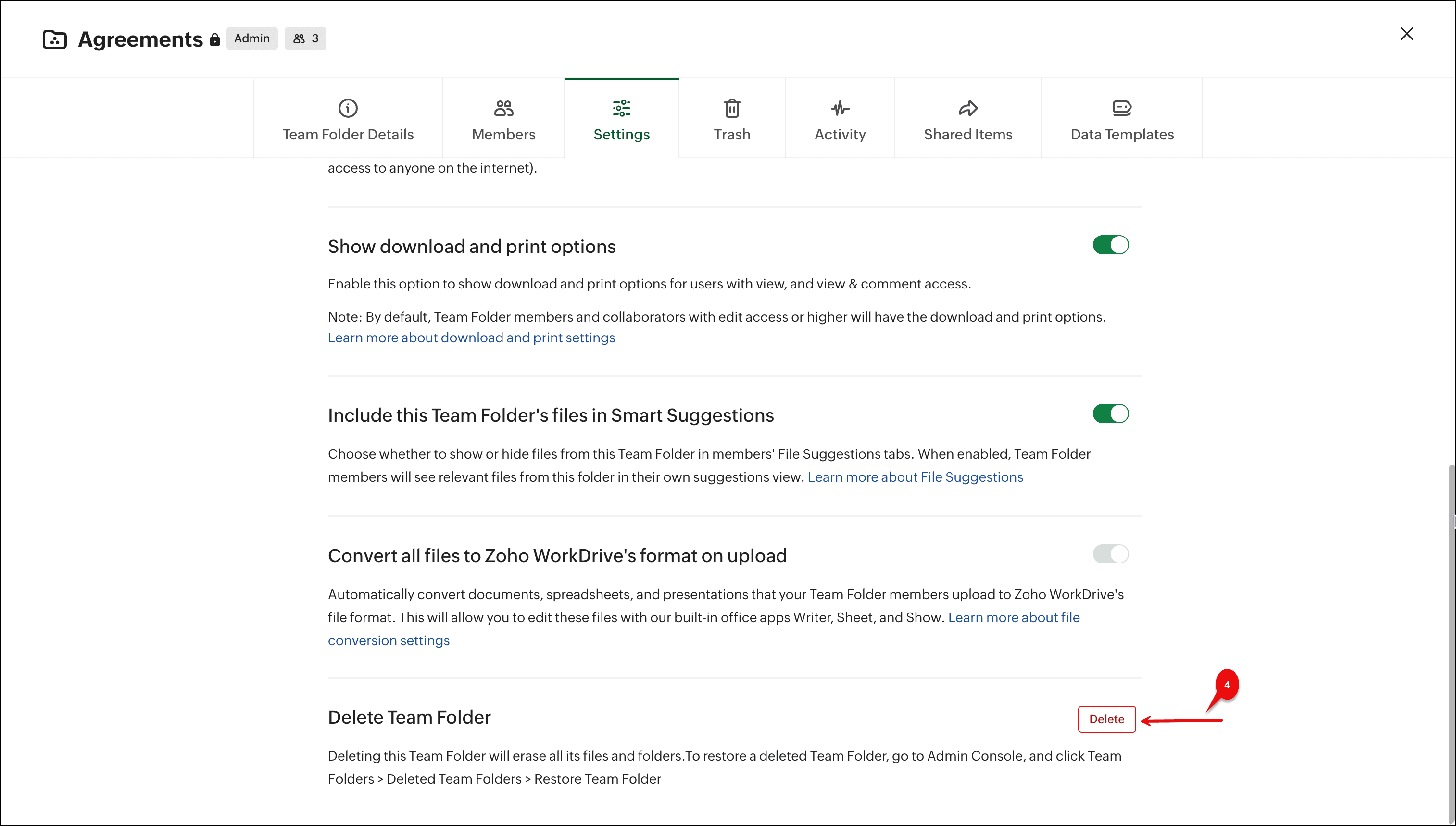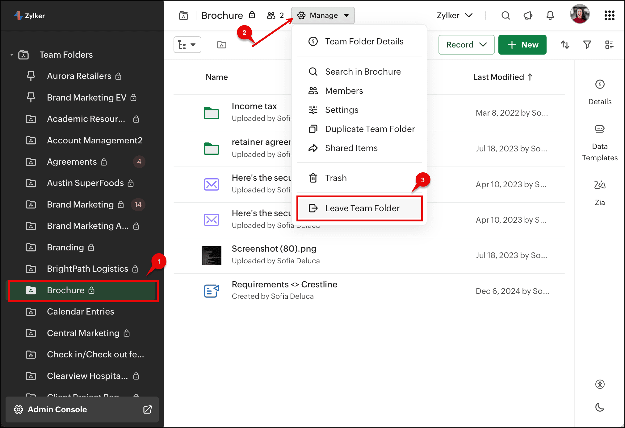Leave or Delete a Team Folder on Zoho WorkDrive