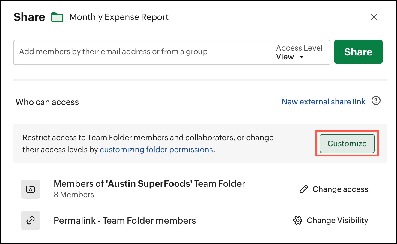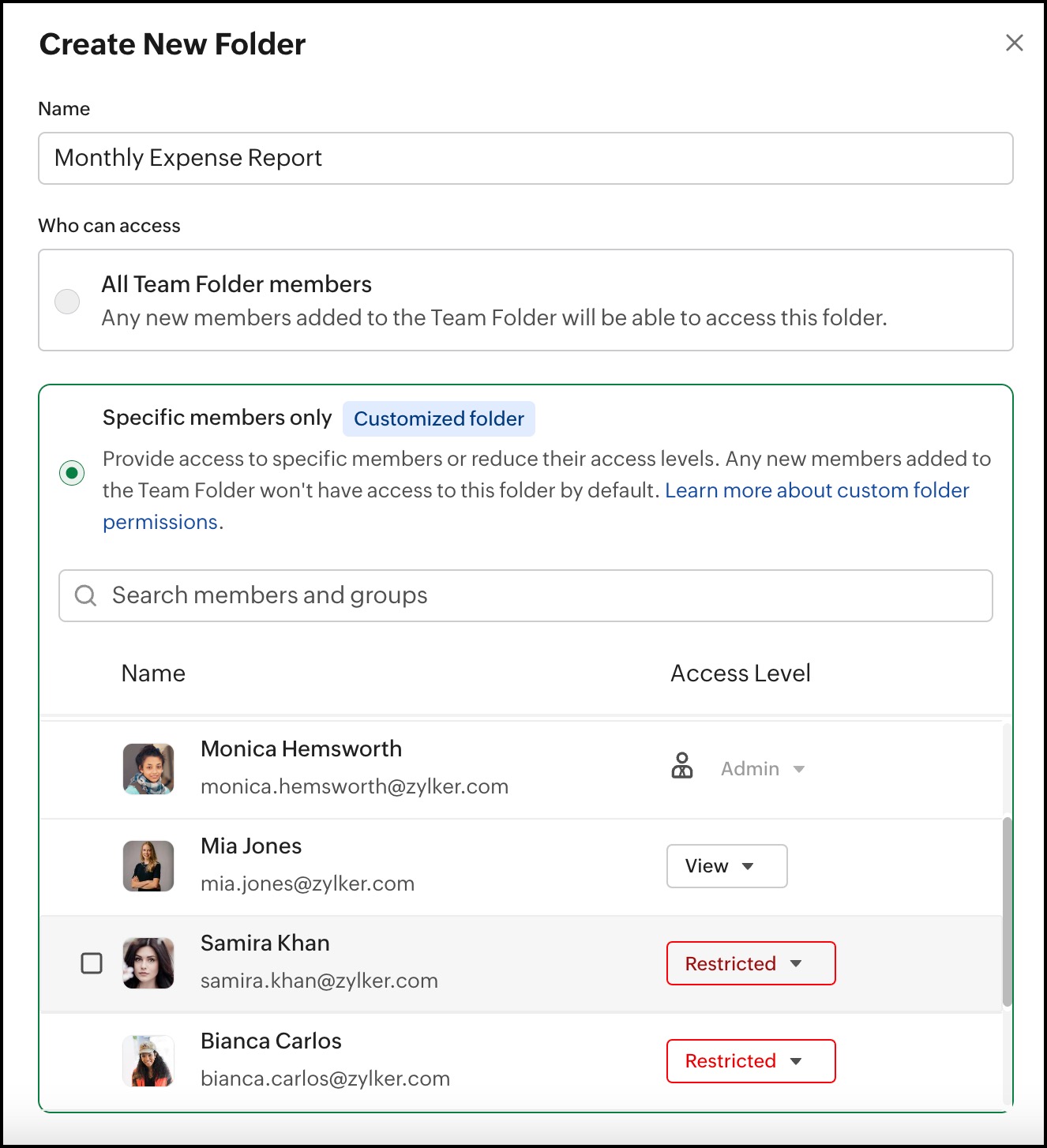 By default, Team folder members will have access to all files and folders within it. If you want to reduce a member's permission for a folder or hide a folder completely from members or collaborators' view, you can use the customize folder permission option.