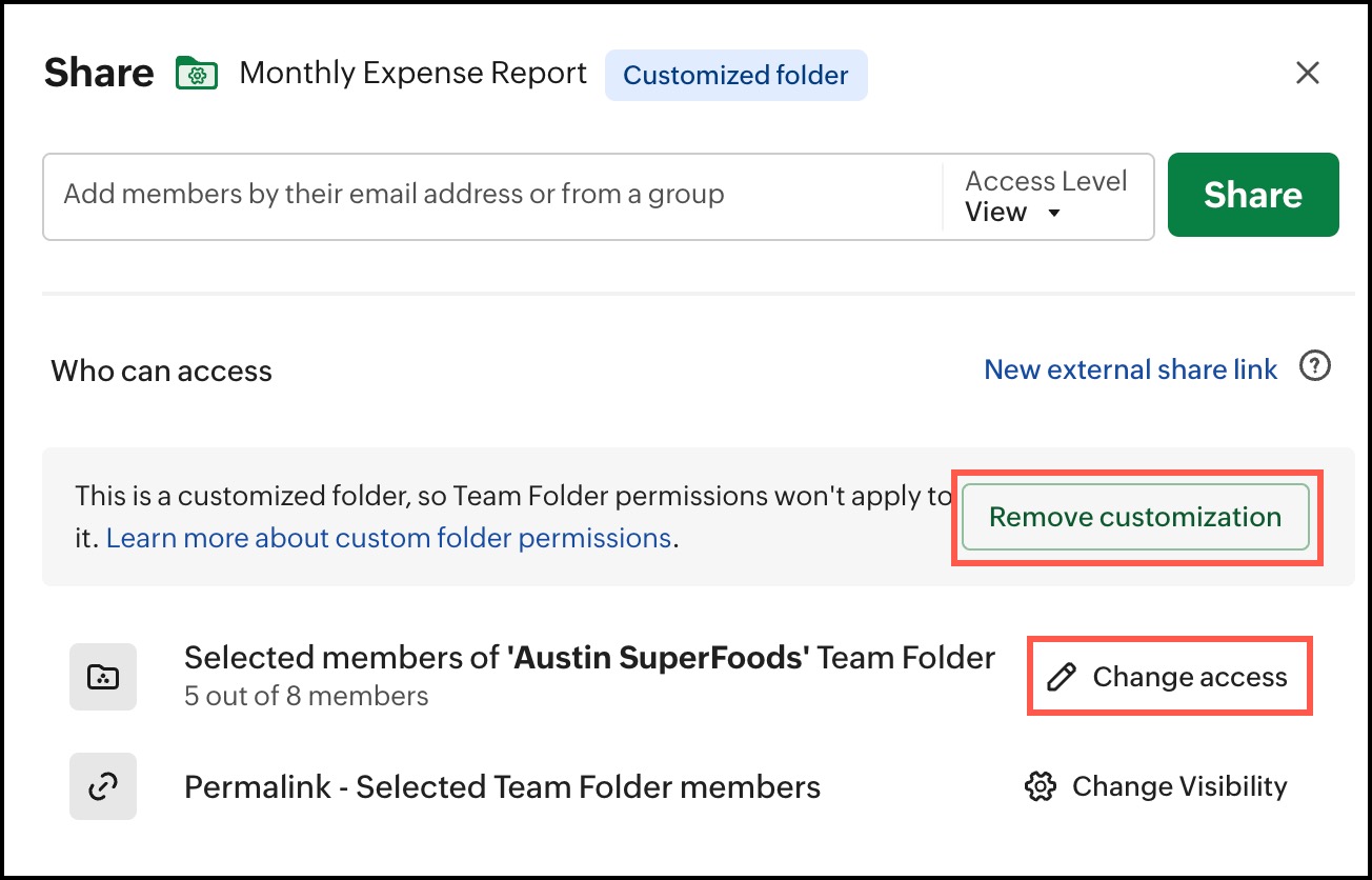 Note: While removing folder customization, all Team Folder members will get access again based on their Team Folder roles. Any existing individual collaborators of the customized folder will lose access.