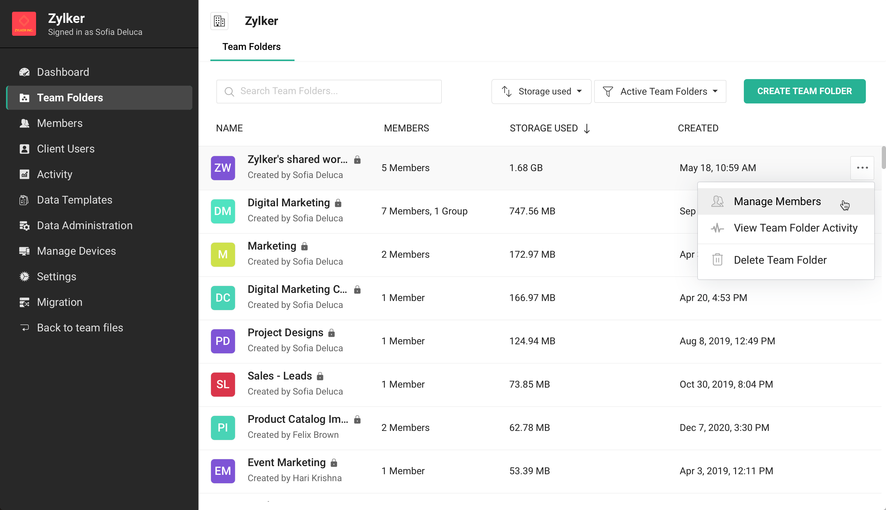 In Zoho WorkDrive, all Team Folders can be managed at the team level by the Team Admins. This allows them to have a complete control over all the Team Folders' settings from one central space.