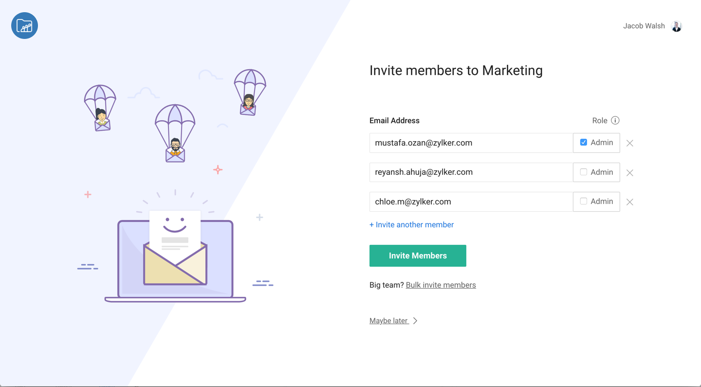 6. If you choose to invite your team members, enter the email address of your team members individually, assign a role, and click Invite Members