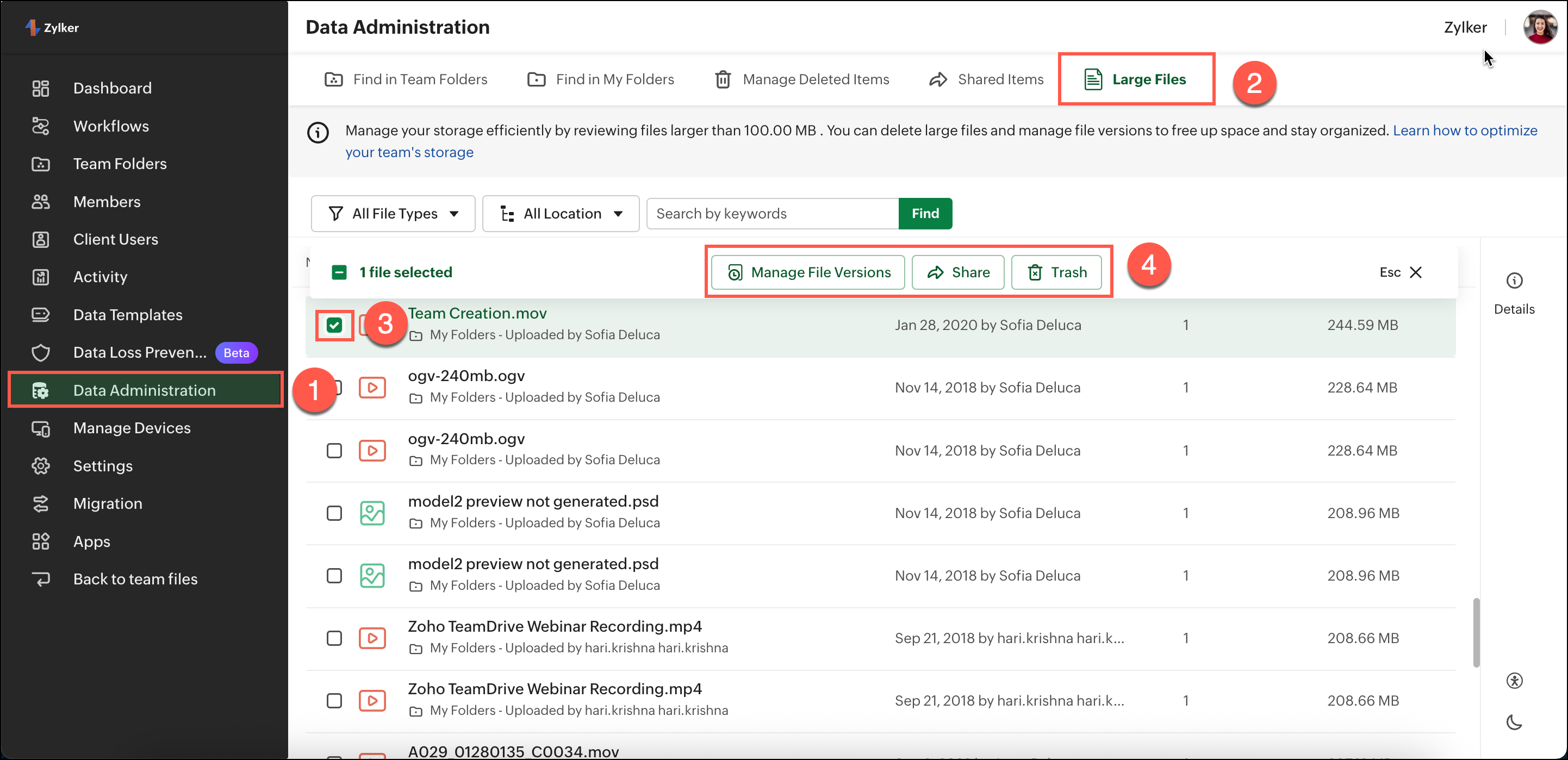 Feature availability: Available only for WorkDrive Business Plan usersTo ensure your team’s storage is used efficiently, WorkDrive provides a dedicated section for admins to identify and manage large files (files greater than 100 MB) stored within the team. These could be videos, design files, high-resolution images, presentations, or other space-consuming files.