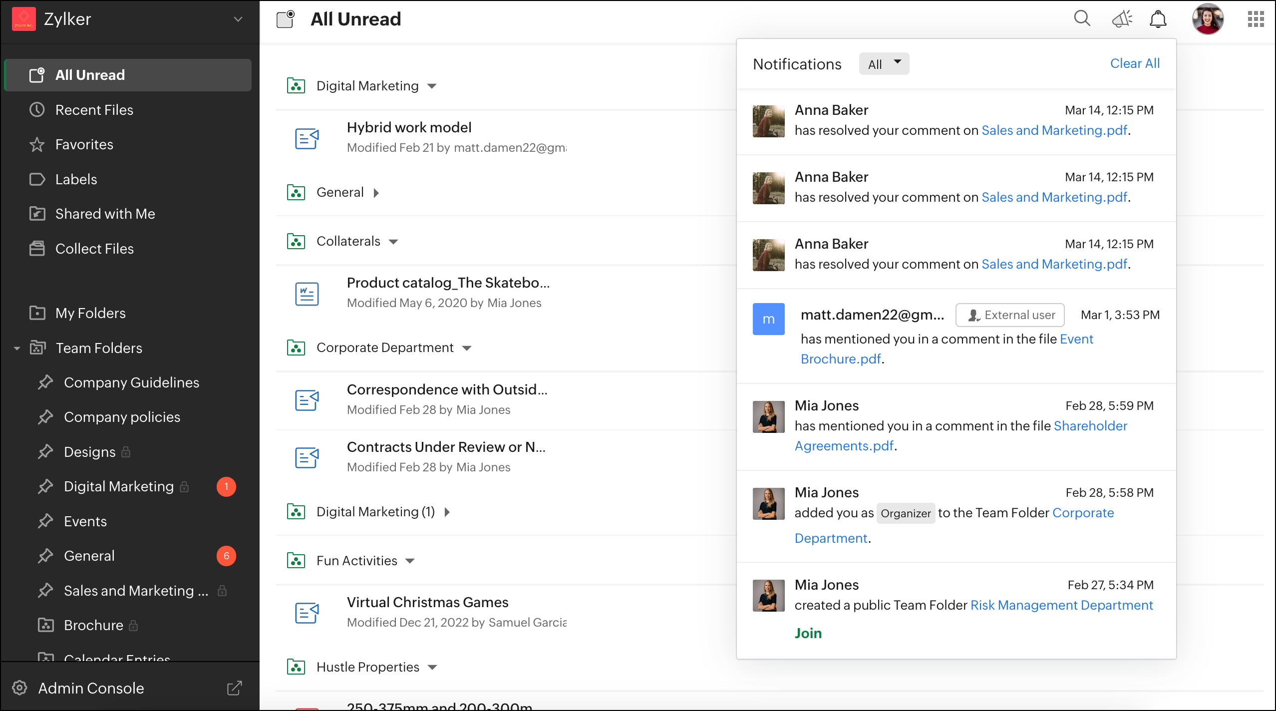 Notifications of all Team Folders can be collectively seen in the All Unread section.