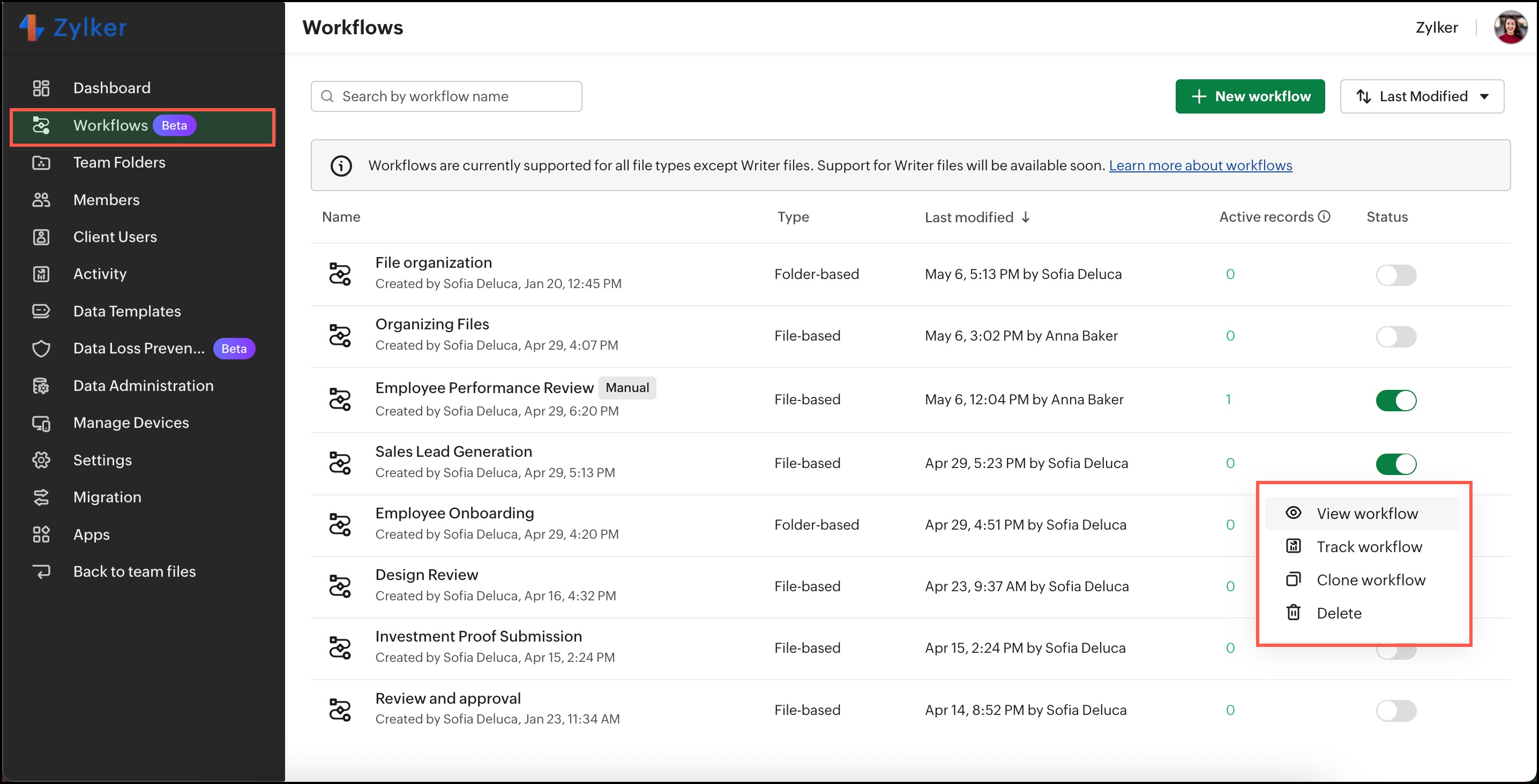 As an admin or super admin of a WorkDrive team, you can manage all the created workflows across your team. Here you can view, edit, manage, and delete workflows as needed.