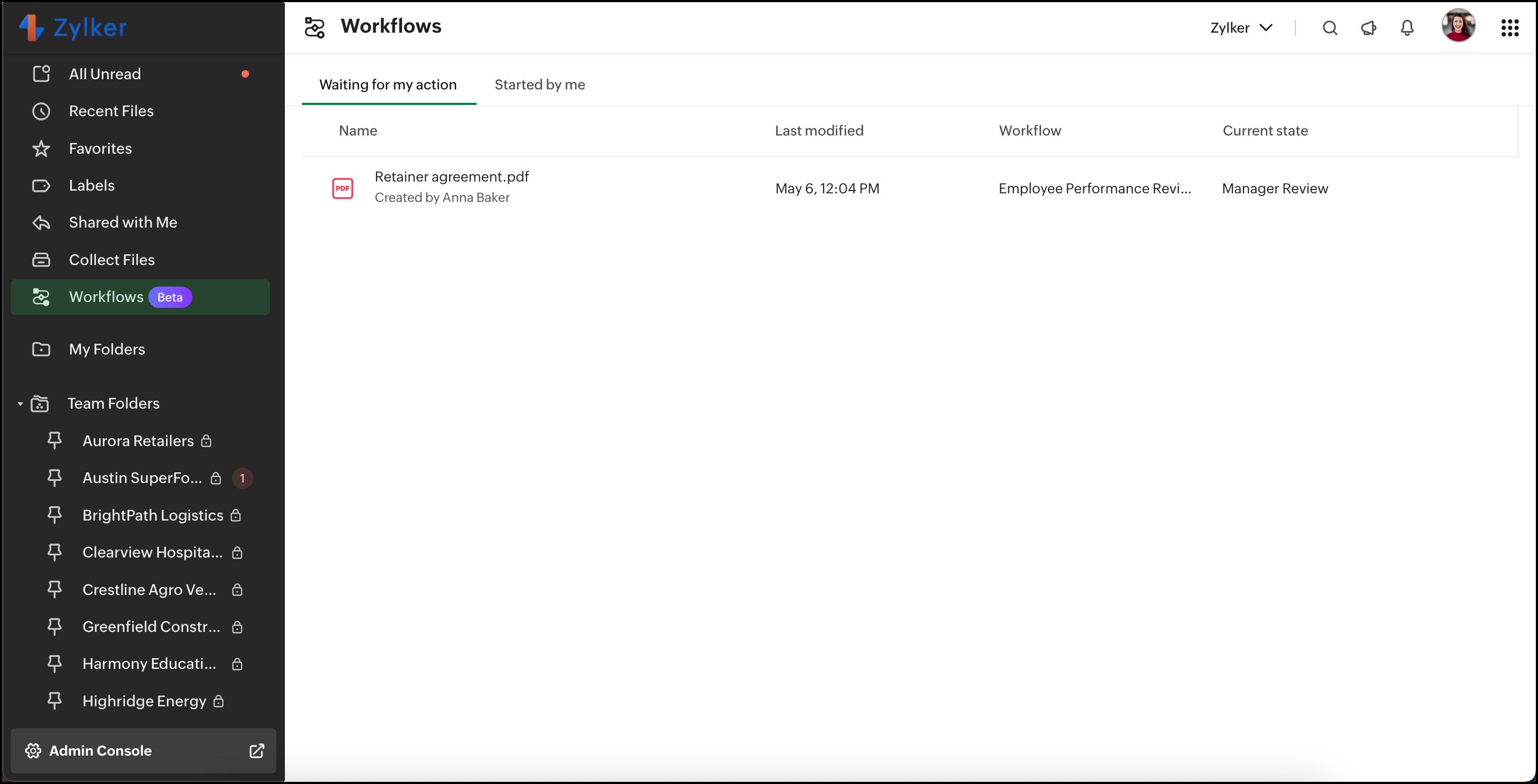 The Workflows tab in the left pane helps you manage workflows effortlessly. It provides two sections: Waiting for my action and Started by me, ensuring you can keep track of workflows assigned to you and those you’ve initiated.