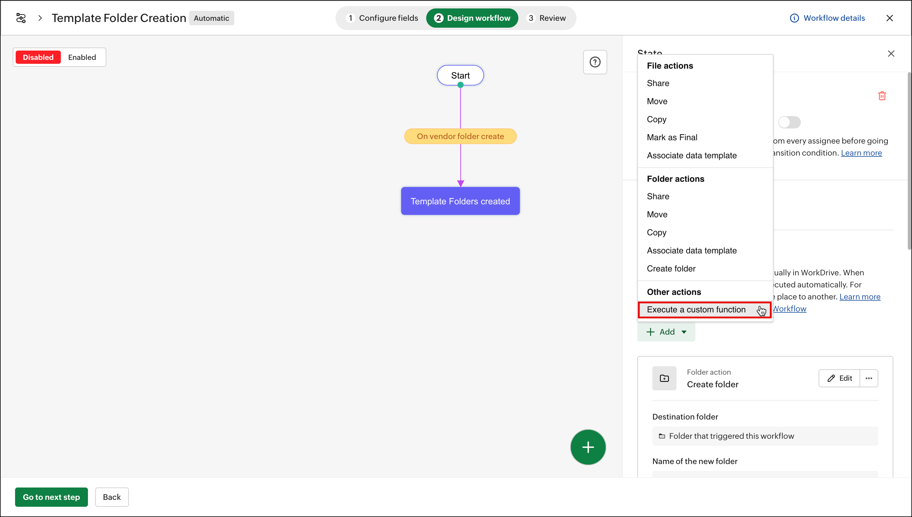 You can create a new folder within any transition or state of your workflow. This action will create a new folder in the destination location automatically when the predefined conditions are met, enabling you to organize files and folders efficiently.