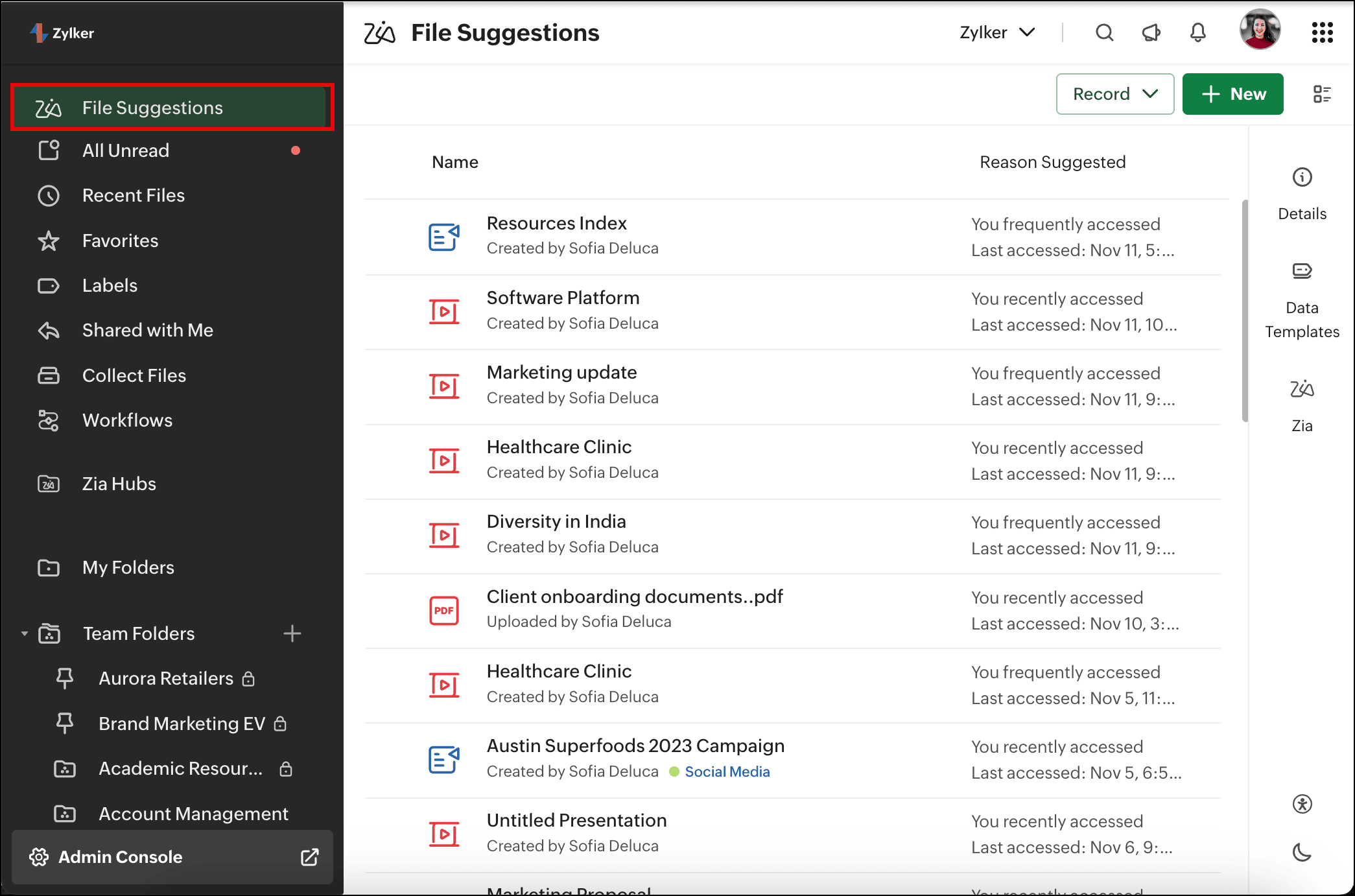Available only for WorkDrive Business plan and Zoho One bundle users.File Suggestions helps you quickly access the files you need, without having to search or browse through folders. This tab lists smart, personalized file recommendations that reduce time spent looking for files.
