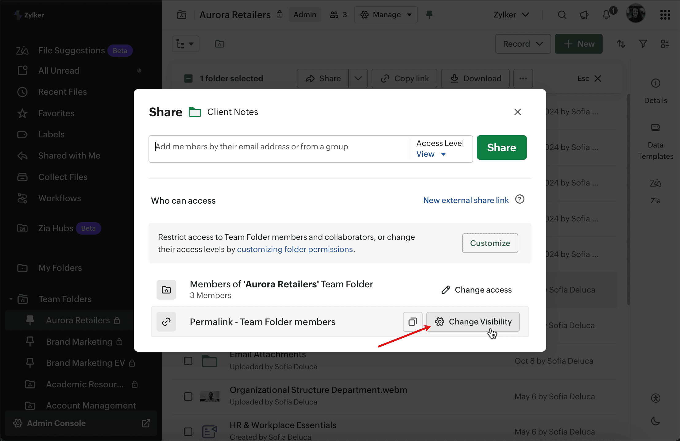 Team Folder admins can decide whether files from a specific Team Folder should appear in the File Suggestions tab for other members of the team. This ensures only intended files are surfaced in the team member’s suggestion list.