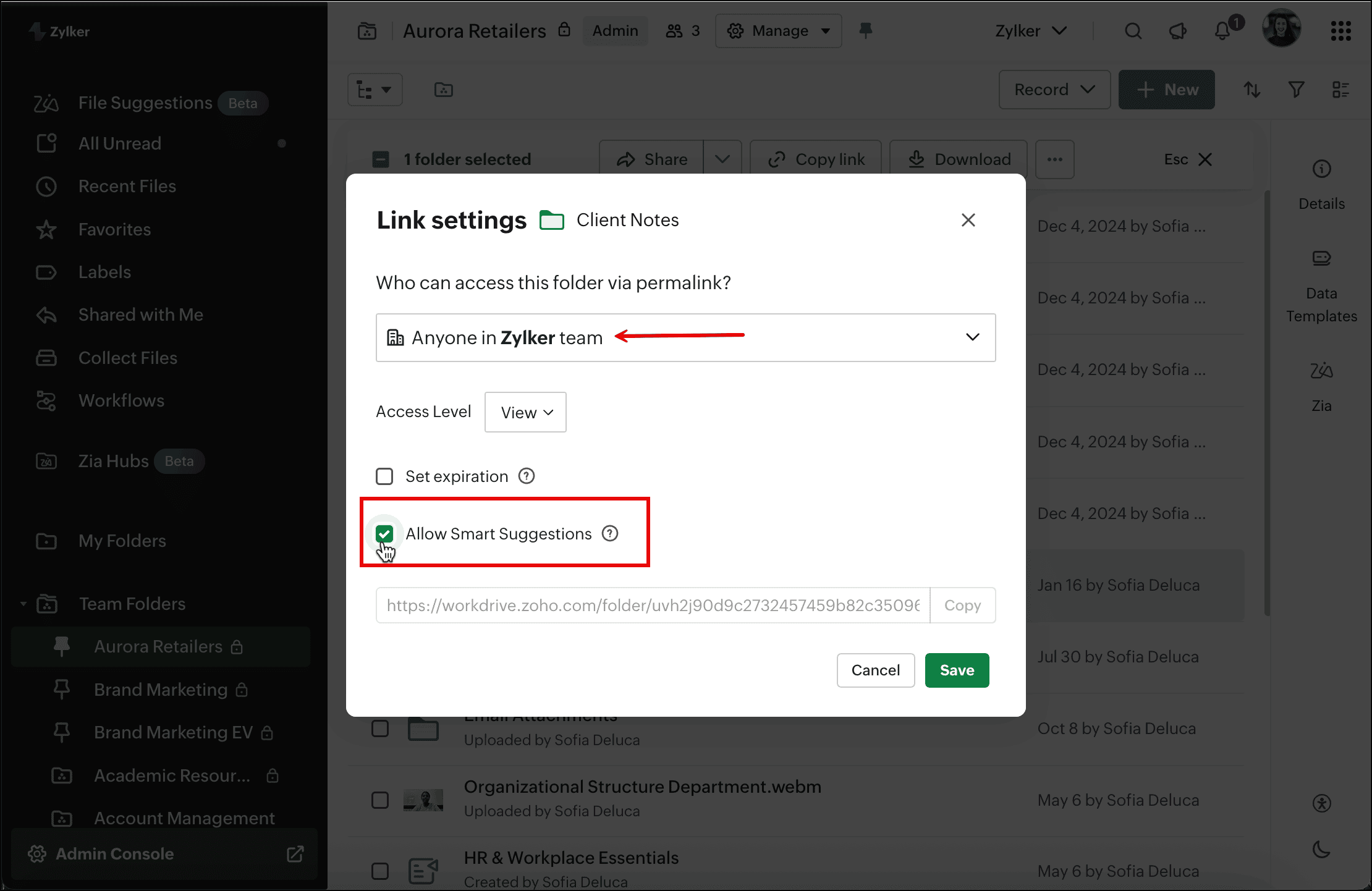 (The Allow Smart Suggestion option appears only when the file is shared with "Anyone in the Team". It will not be available if you're sharing with specific users or groups.)
