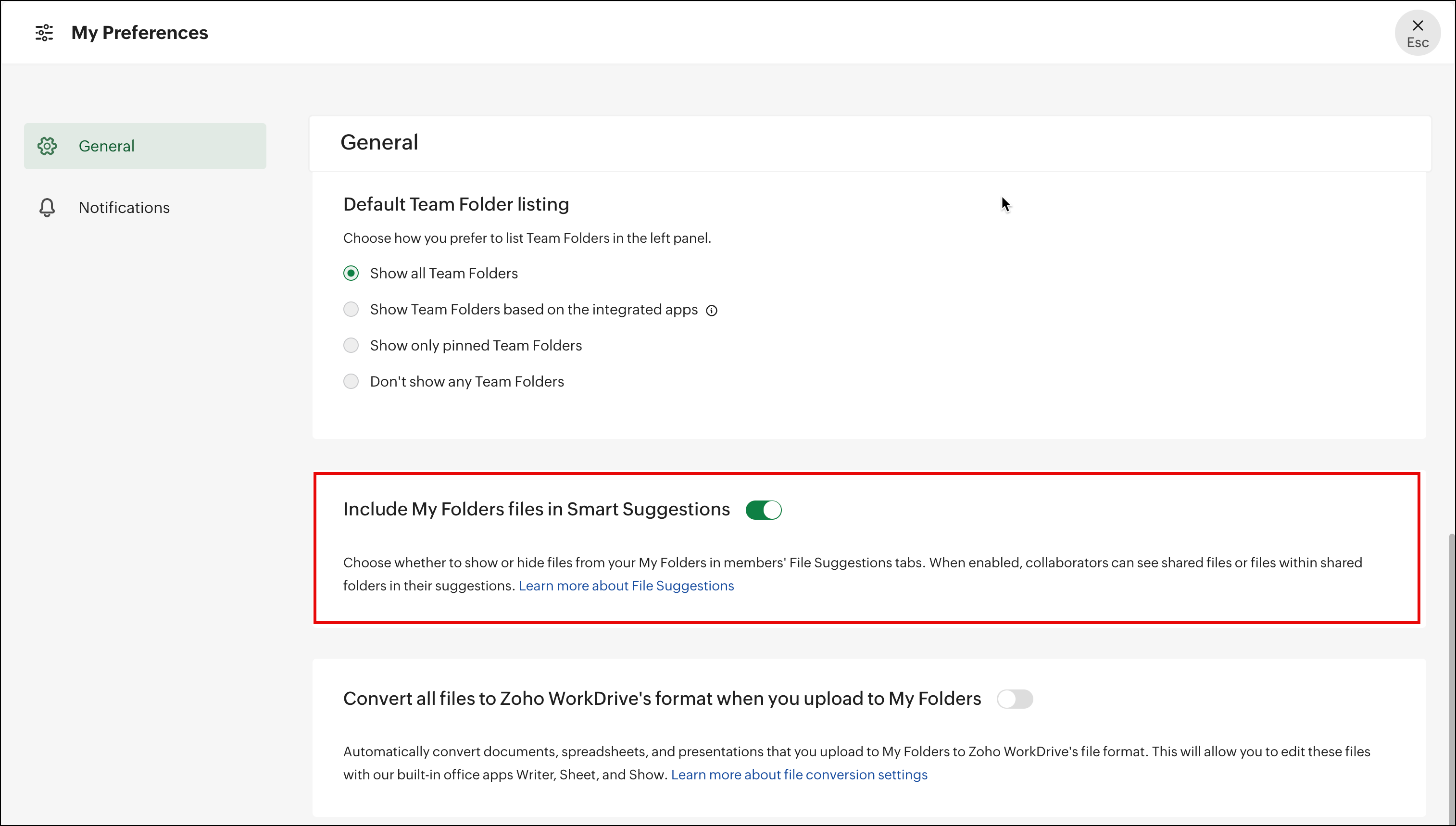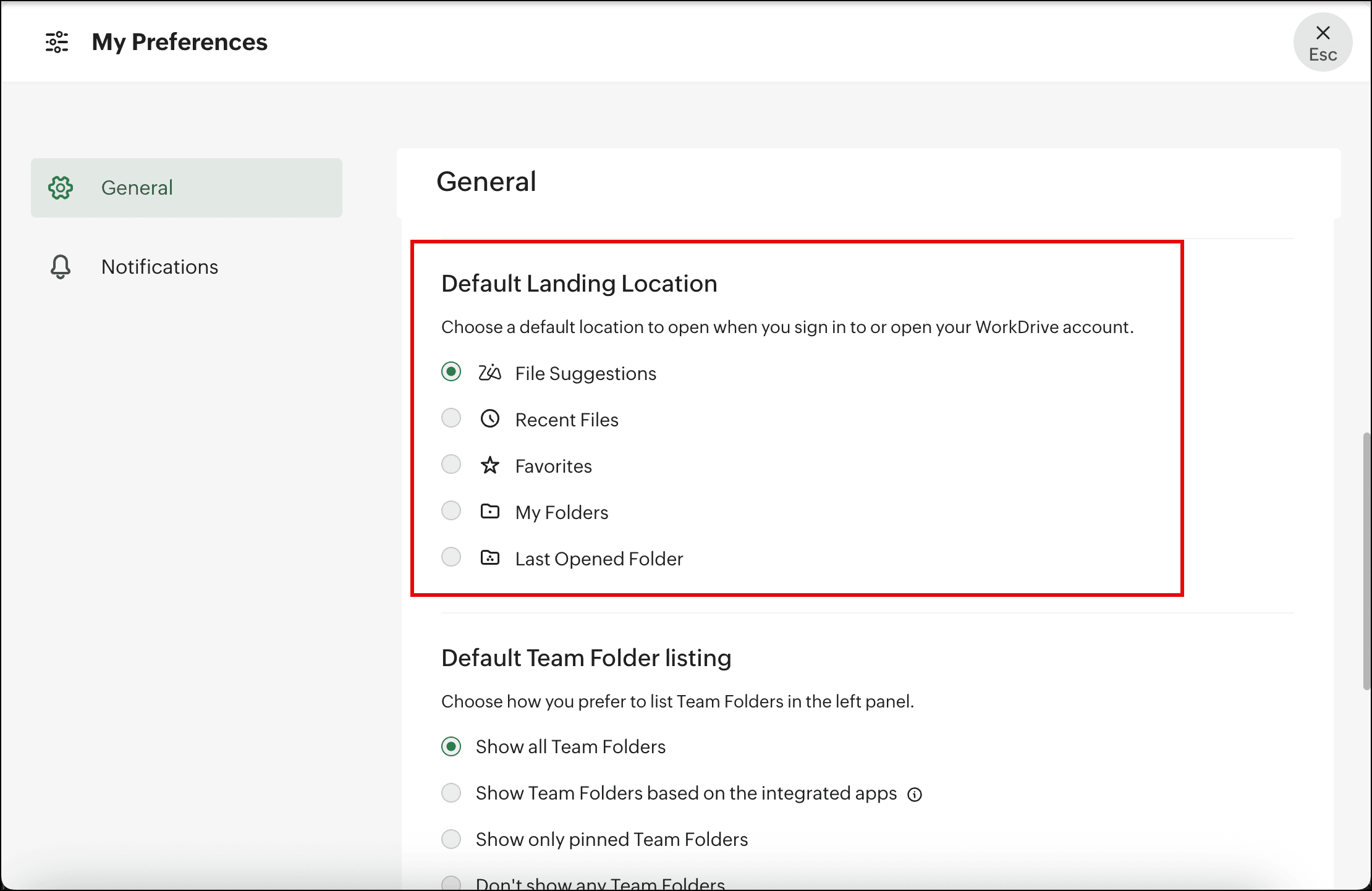 Select My Preferences under the My WorkDrive section. The General tab will open by default.