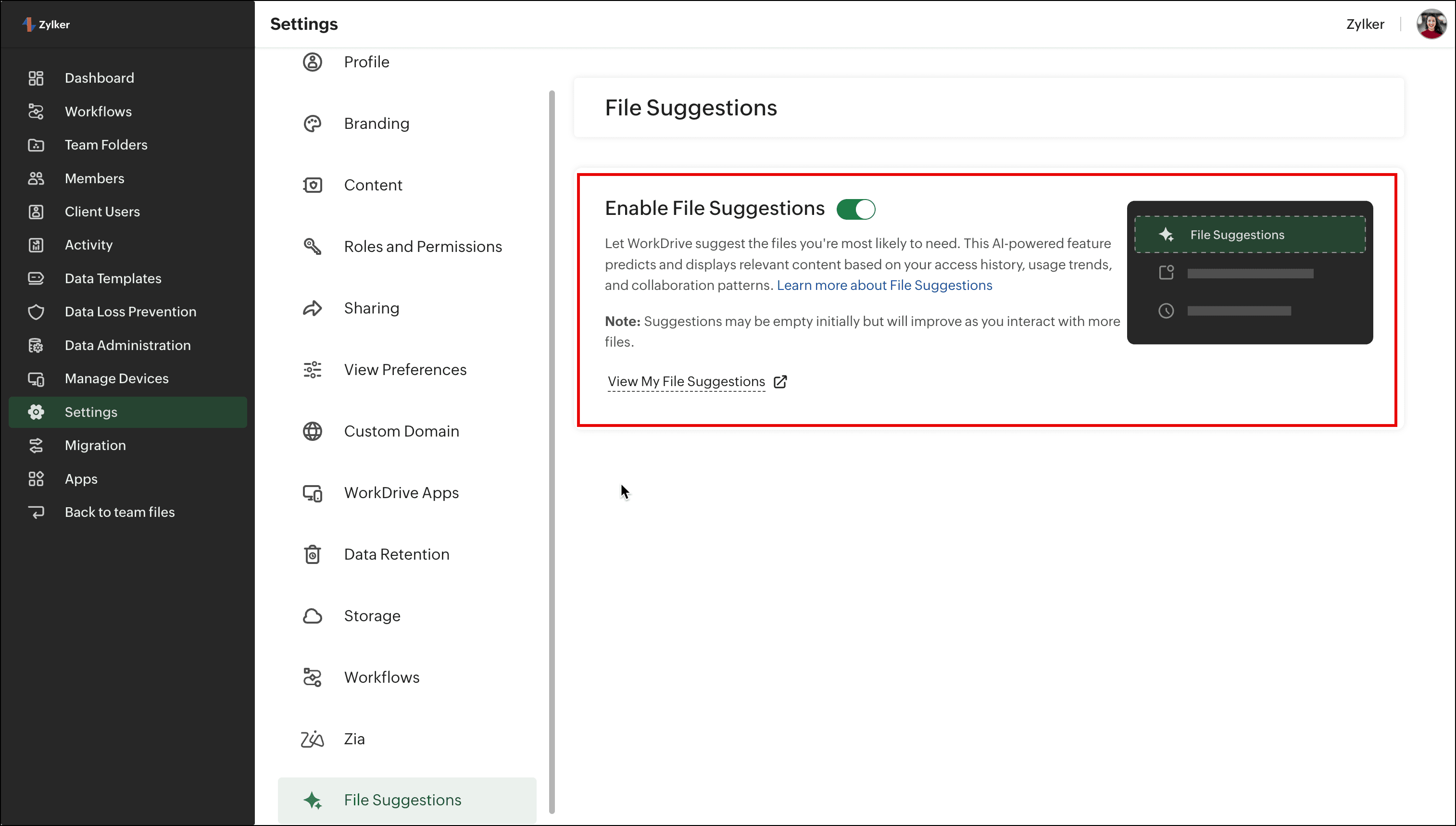 Once enabled, the File Suggestions tab will appear in the left panel of WorkDrive home screen for all team members.