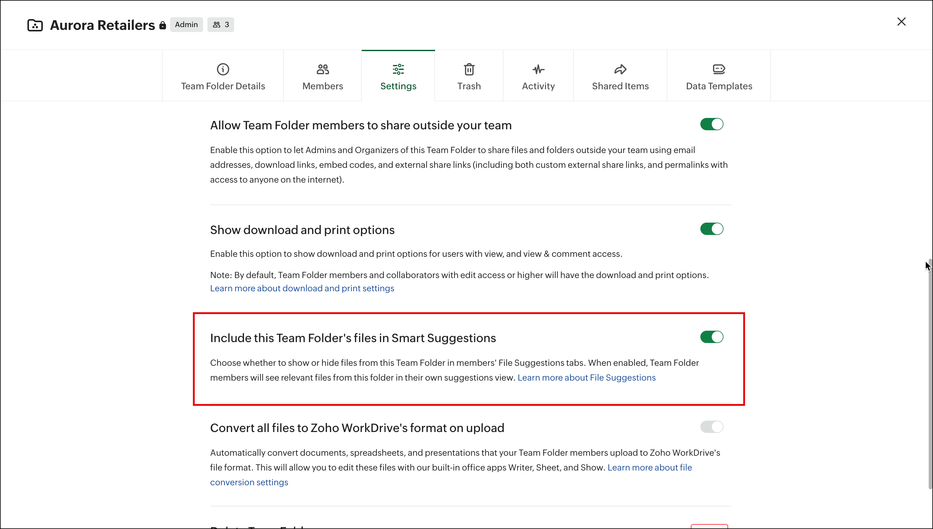Toggle Include this Team Folder's files in Smart Suggestions OFF to hide its files from team members’ File Suggestions tabs.