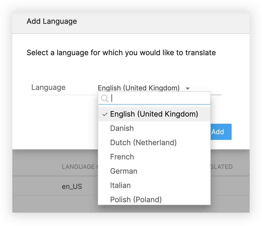 4. In the Add Language pop-up, select a language from the dropdown list.
