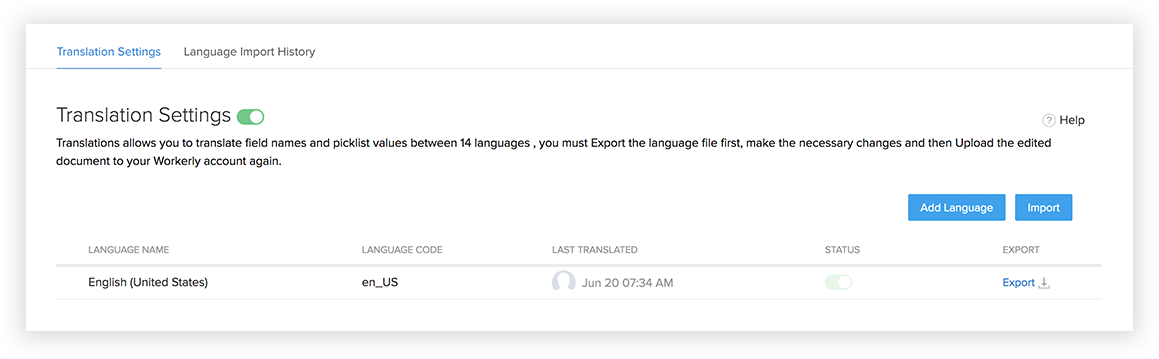 Sometimes when you have already translated a language, you may add later add new custom fields or picklist values in a module. In such cases, you can choose to export the translated file and just translate the new fields and import the language file back into your Workerly account. This will help you to avoid translating all the fields again. Alternatively, you can export an untranslated language file and translate all the fields.