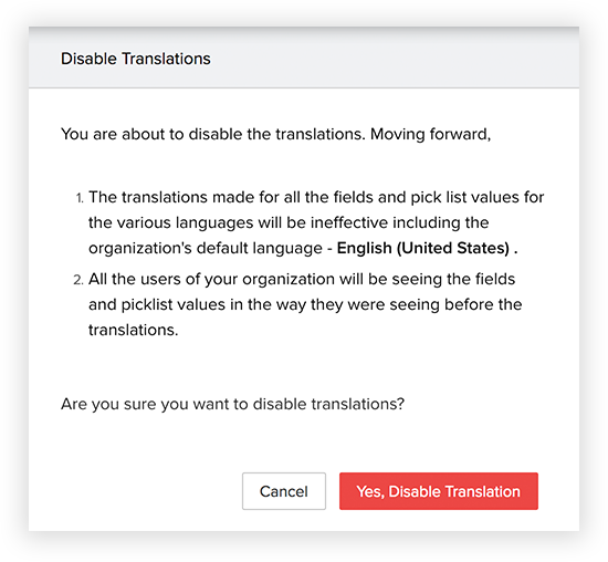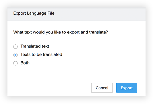 Once you add the languages, export the language file that you want to translate. An export file contains all the picklist values and the custom fields that need to be translated. You can choose to export an individual file, or export all the language files at once. Once the language file is exported, you can translate the picklist values and custom fields in an export file either yourself or outsource to a vendor. The exported file will contain instructions on how to read the different values depicted in it.