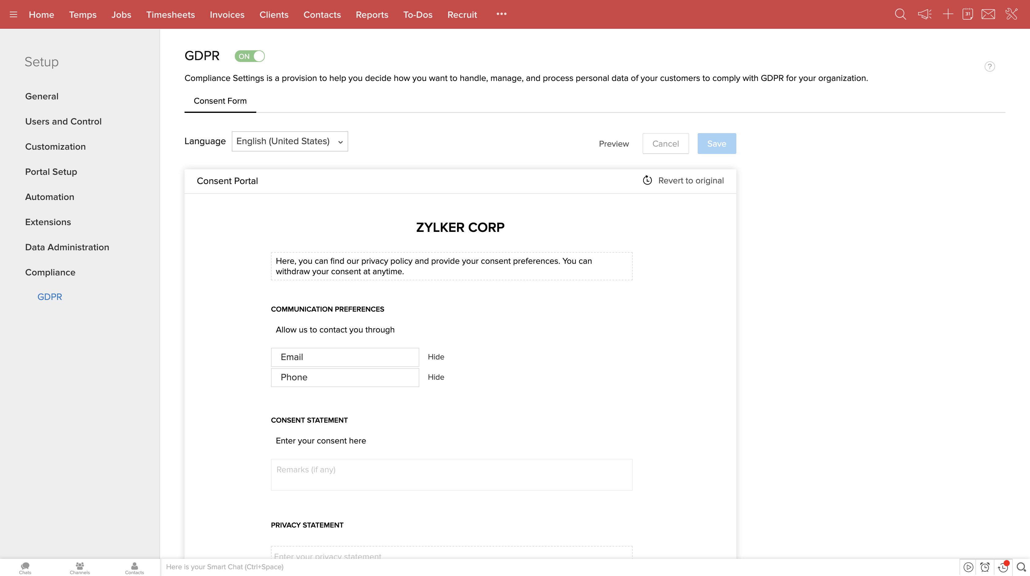 Zoho Workerly's consent management settings help you get consent from your data subjects. You can customize a consent form, include it in your email templates, set consent-related preferences, and most importantly, keep track of consent details much easier.