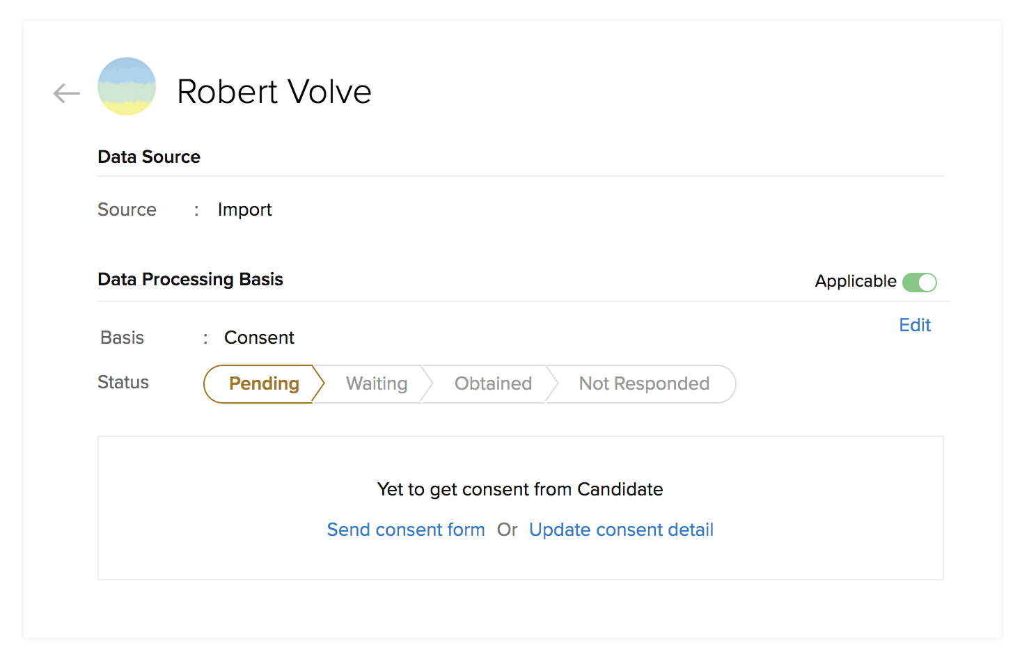There are three stages that you can track in Zoho Workerly with respect to consent as the lawful basis for processing data. Please note that the primary email field is used to update the consent status in all the similar records that have the same email address as the primary one in your Zoho Workerly account. For example, you get consent from a temp, and when you convert the temp to a contact, the created contact will be updated with the consent status. If the primary email address is changed, you will need to get consent again.