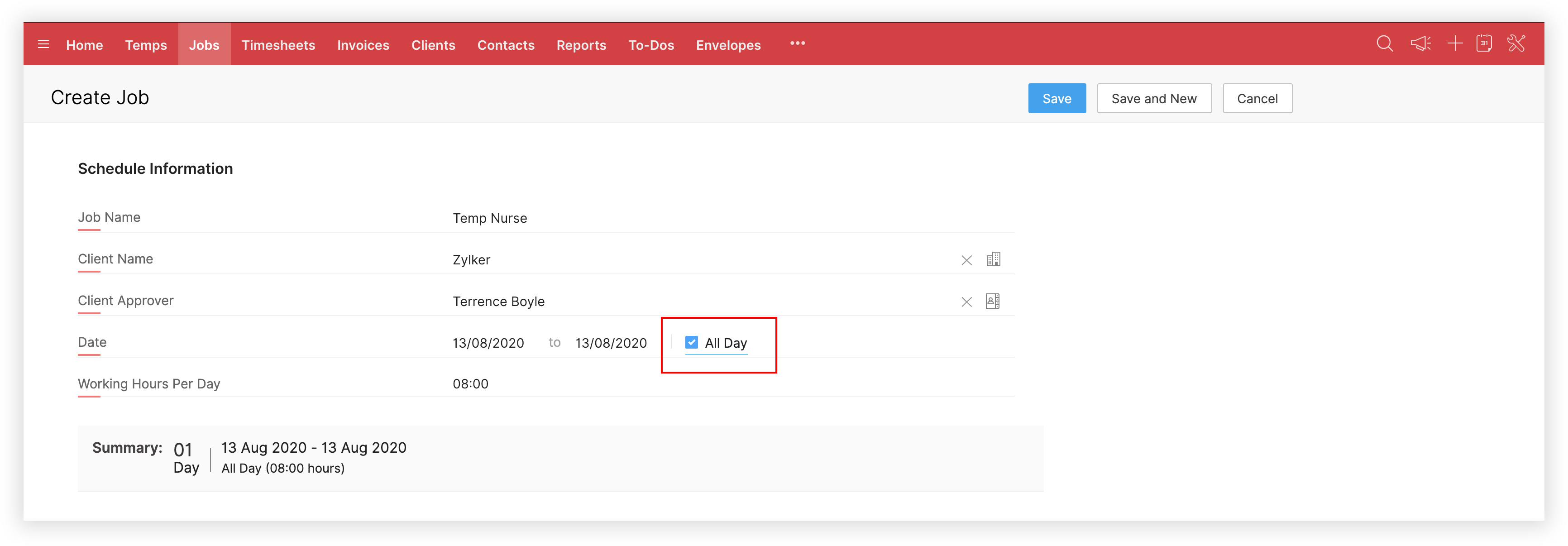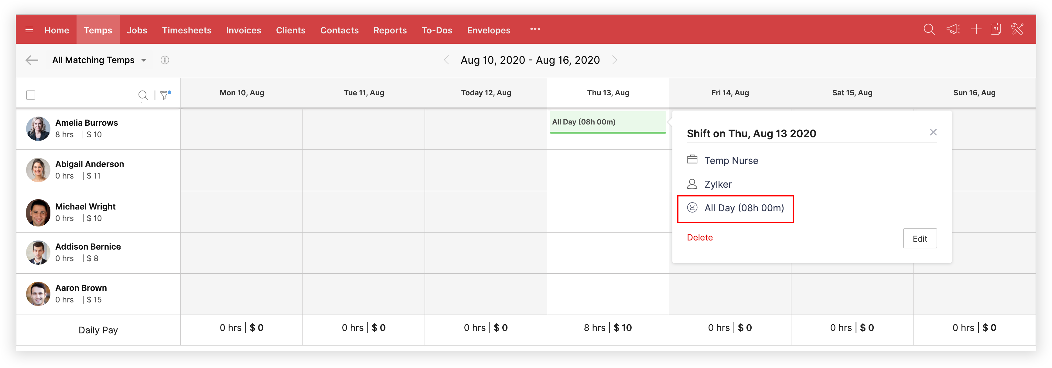 When you schedule a temp, their working hours will be auto-populated (eight hours in our Zylker scenario).
