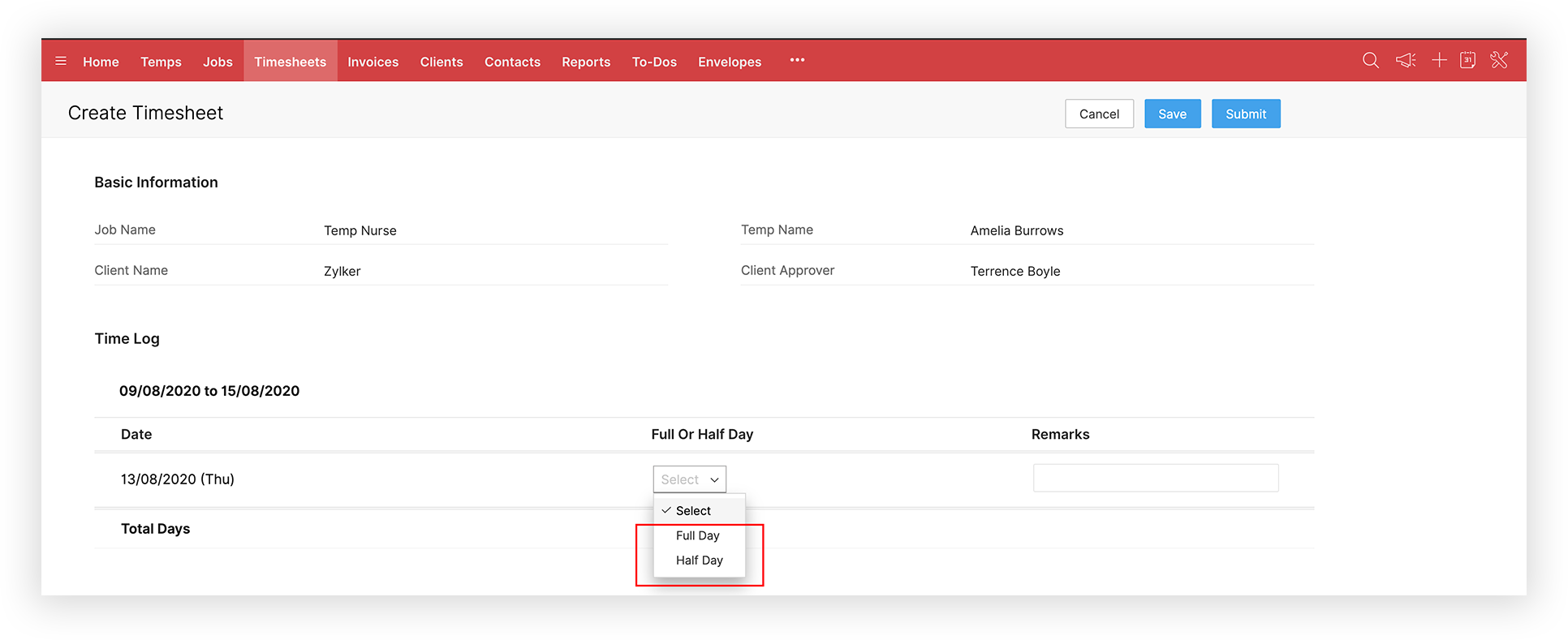 Half Day: It will be assumed that the temp has worked for half of the working hours you have declared on your company details page.
