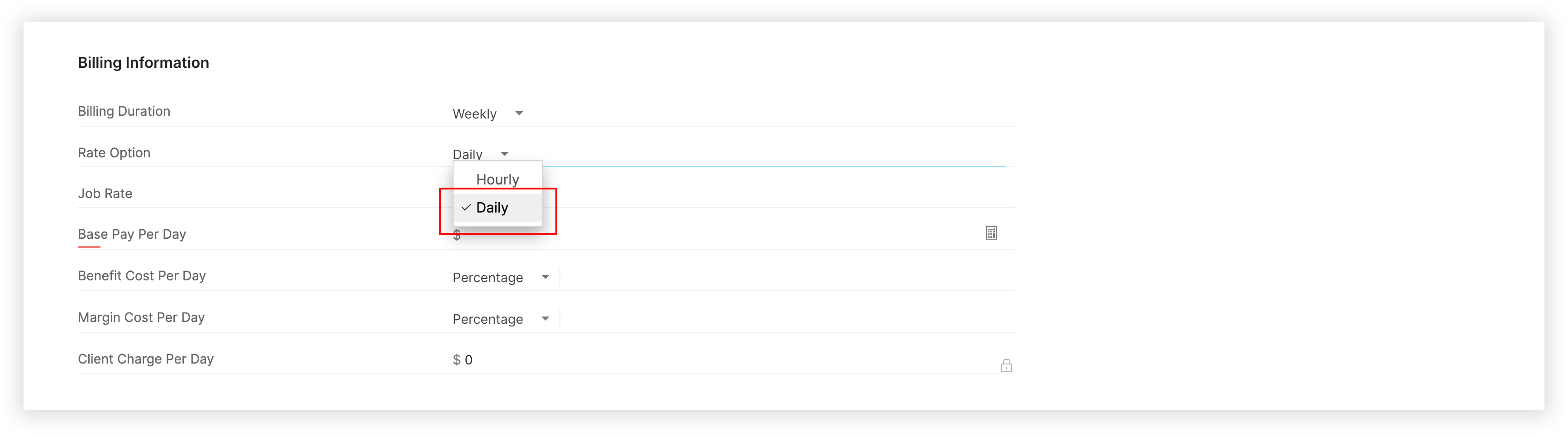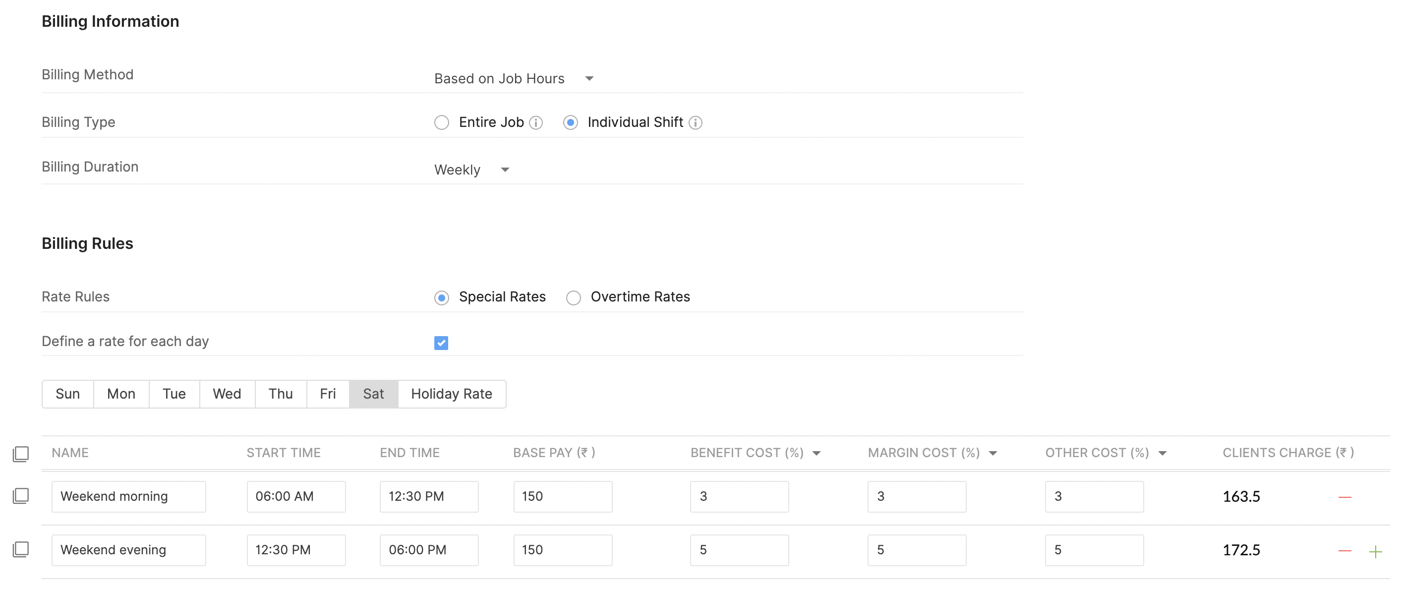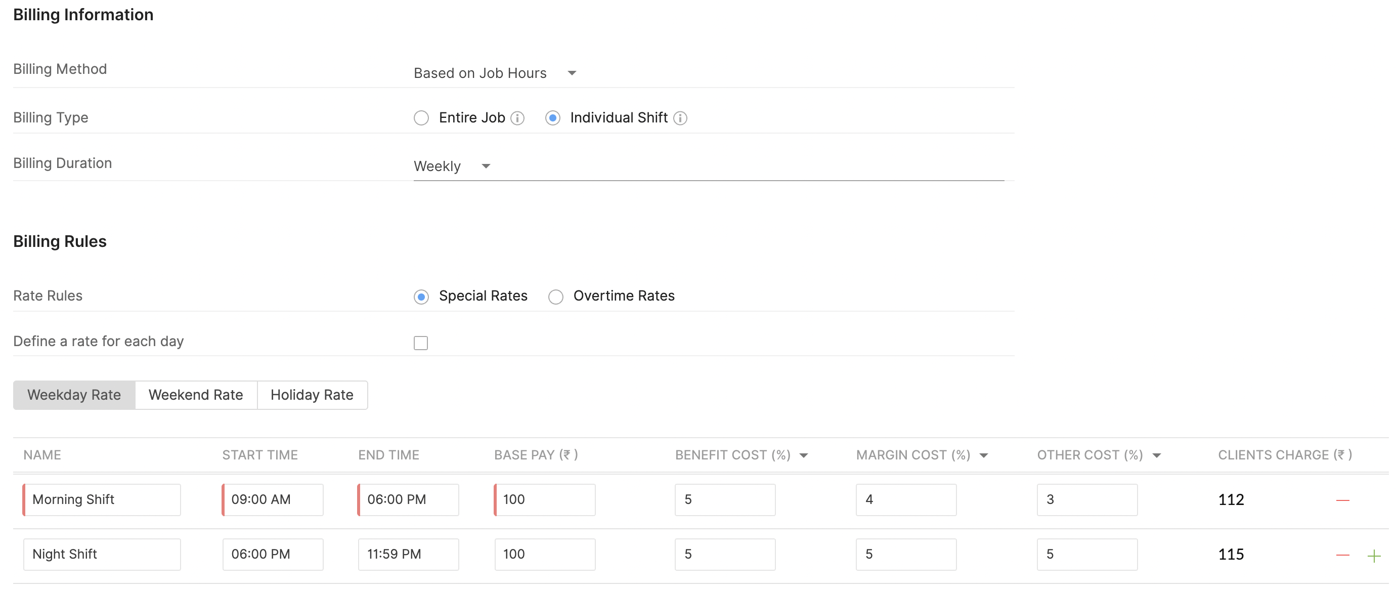On selecting the billing type based on individual shifts, you can now input the details for Weekday Rates, Weekend Rates, and Holiday Rates, with separate Base Pay, Margin Cost, and Benefit Cost with respect to that shift.