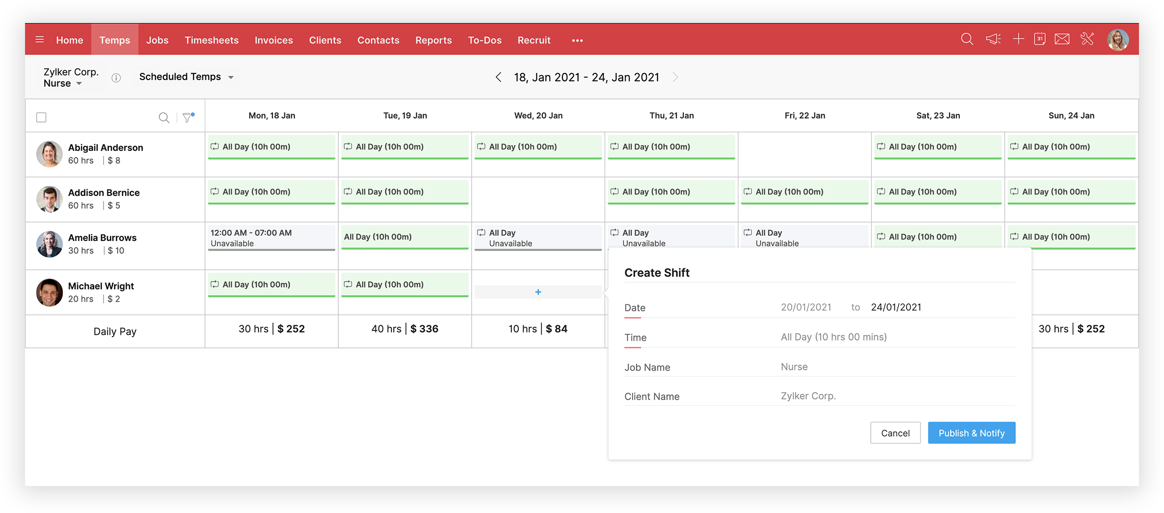 4. Click Publish & Notify. The shift is successfully created and the temp will be notified.