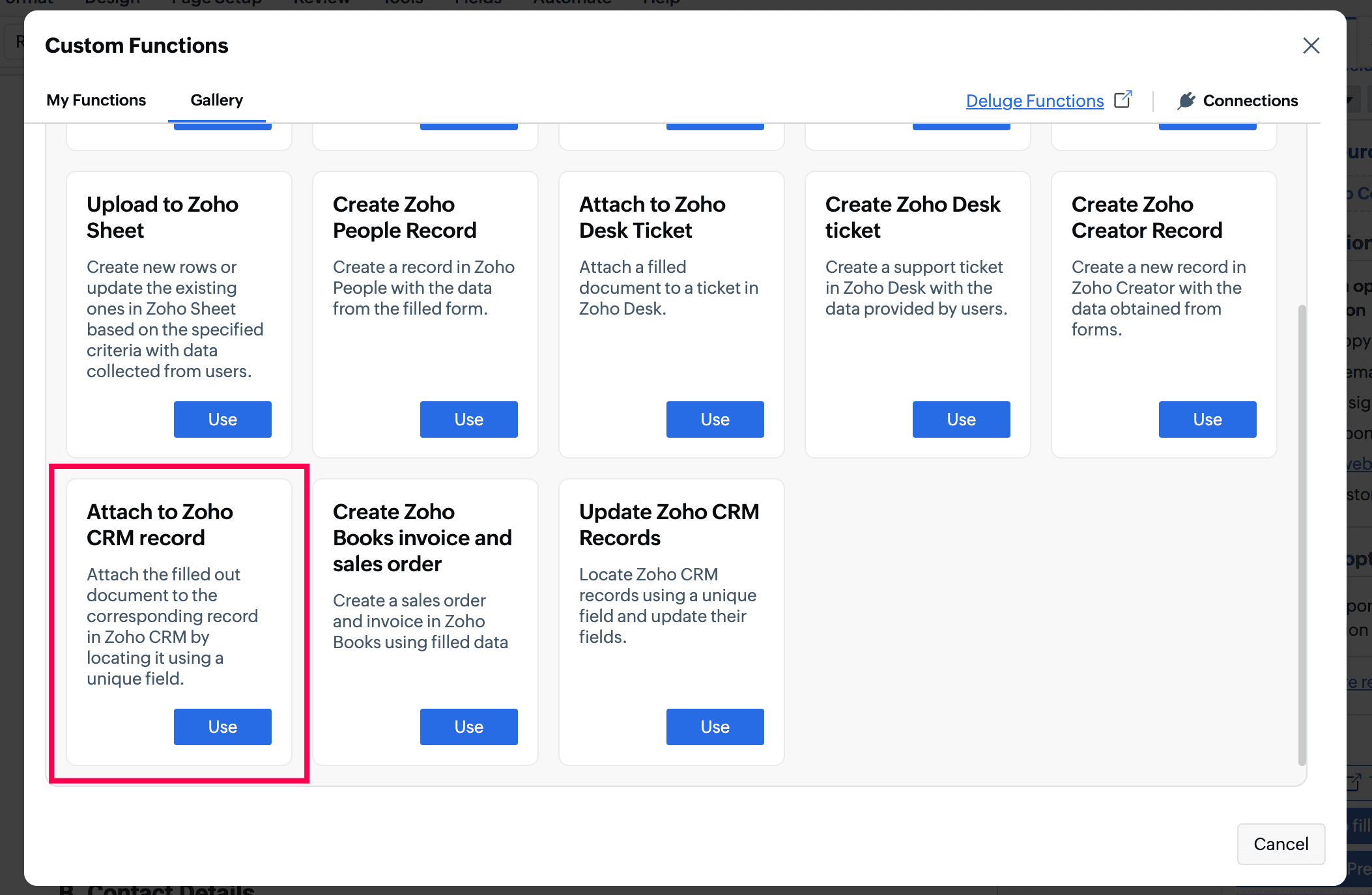 - Click Configure to choose function from the built-in Gallery to push the submitted data directly to Zoho CRM.