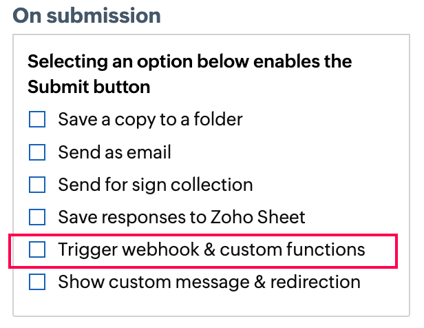 - Under the On Submission section, select the Trigger Webhook & Custom Functions option.