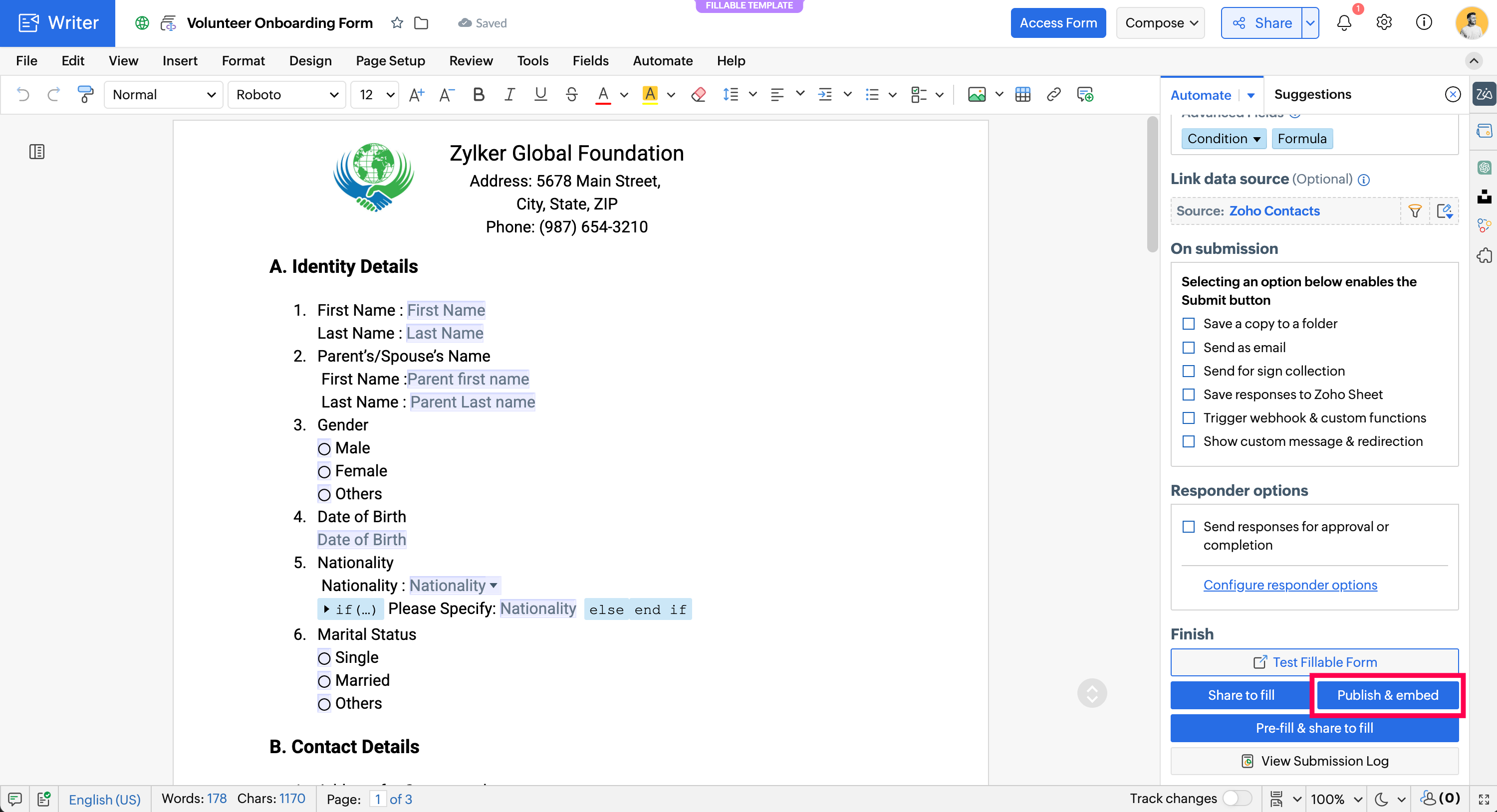 How to publish and embed a fillable form in Zoho Writer (webform)