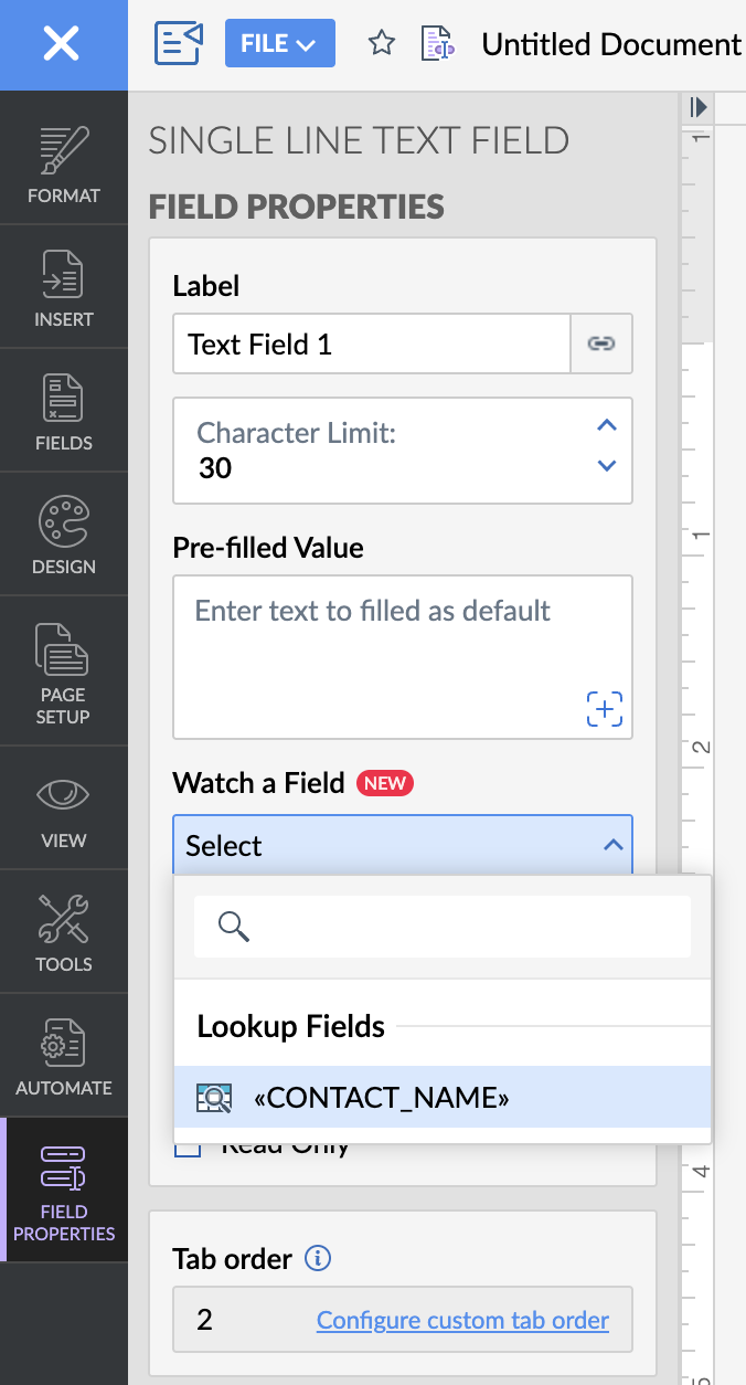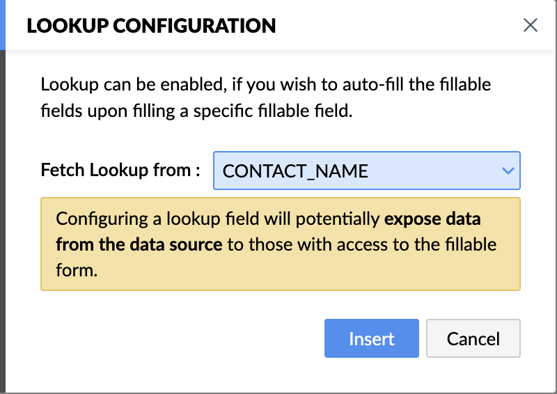 Lookup fields automatically fetch and fill data from a linked data source. They’re available only in Fillable Templates.