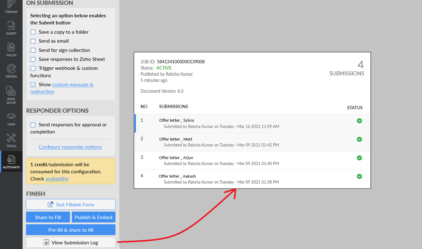 2. On the left pane, go to the Automate tab > Finish, and click View Submission Log. You will be able to view all the form submissions, along with details such as the submitter's name and time of submission.
