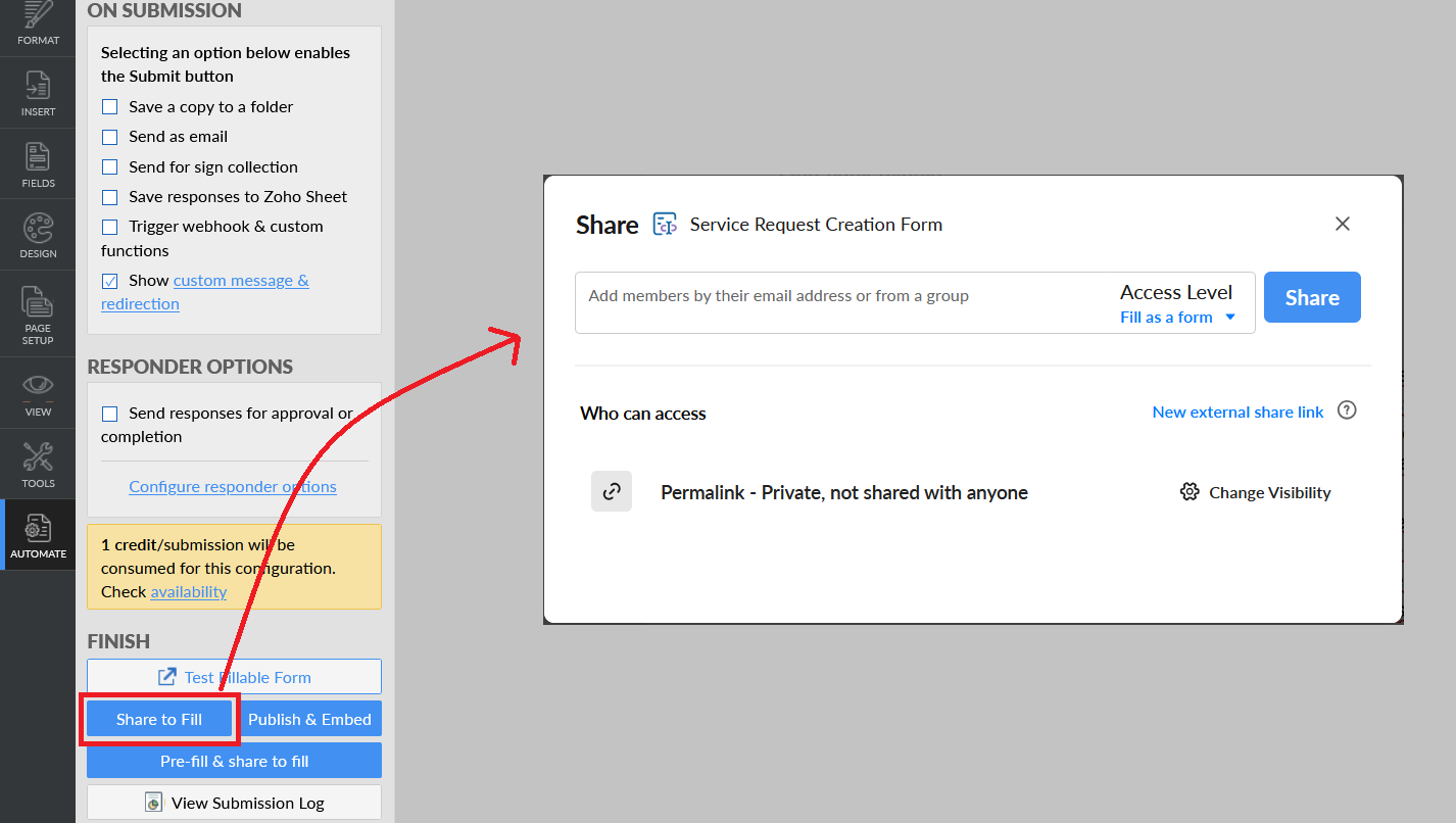 1. Select "Fill as a form" as access level, enter the email address of users to whom you wish to share the form, and click Share.