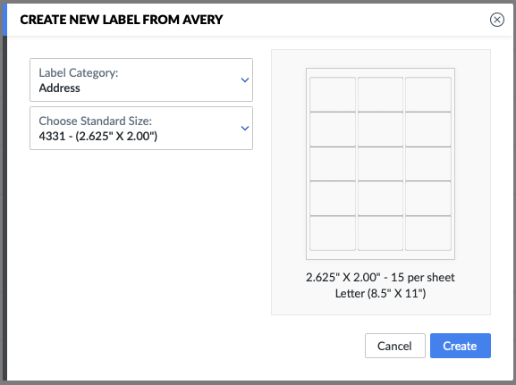 3. In the dialog box that opens, choose your preferred label type and label size and click Create