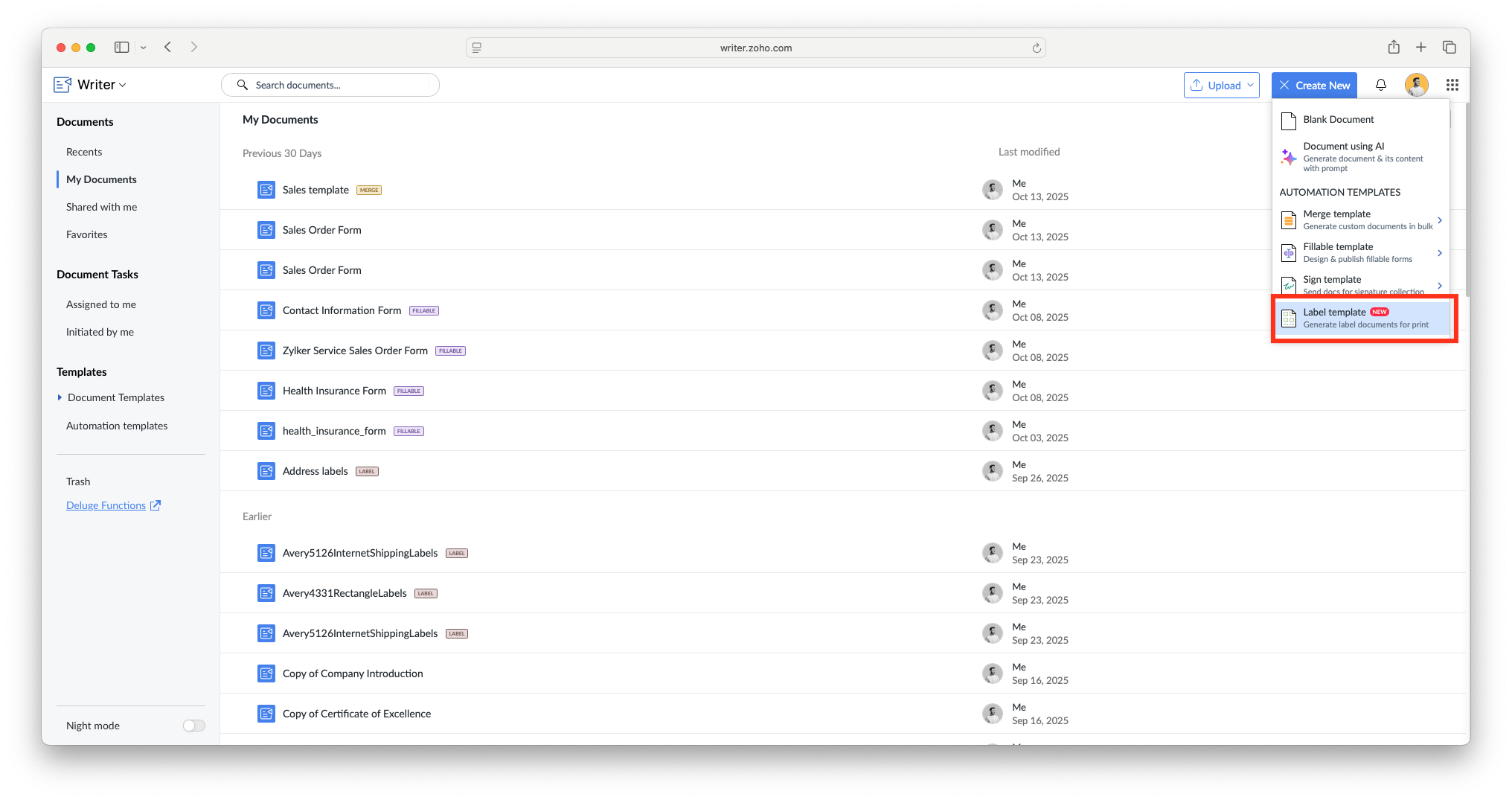 Zoho Writer's label templates allow you to create professional, personalized, ready-to-print labels in Avery or custom specs in just a few clicks. You can create address, shipping, return address, and event badge labels. You can design labels in two ways in Zoho Writer: