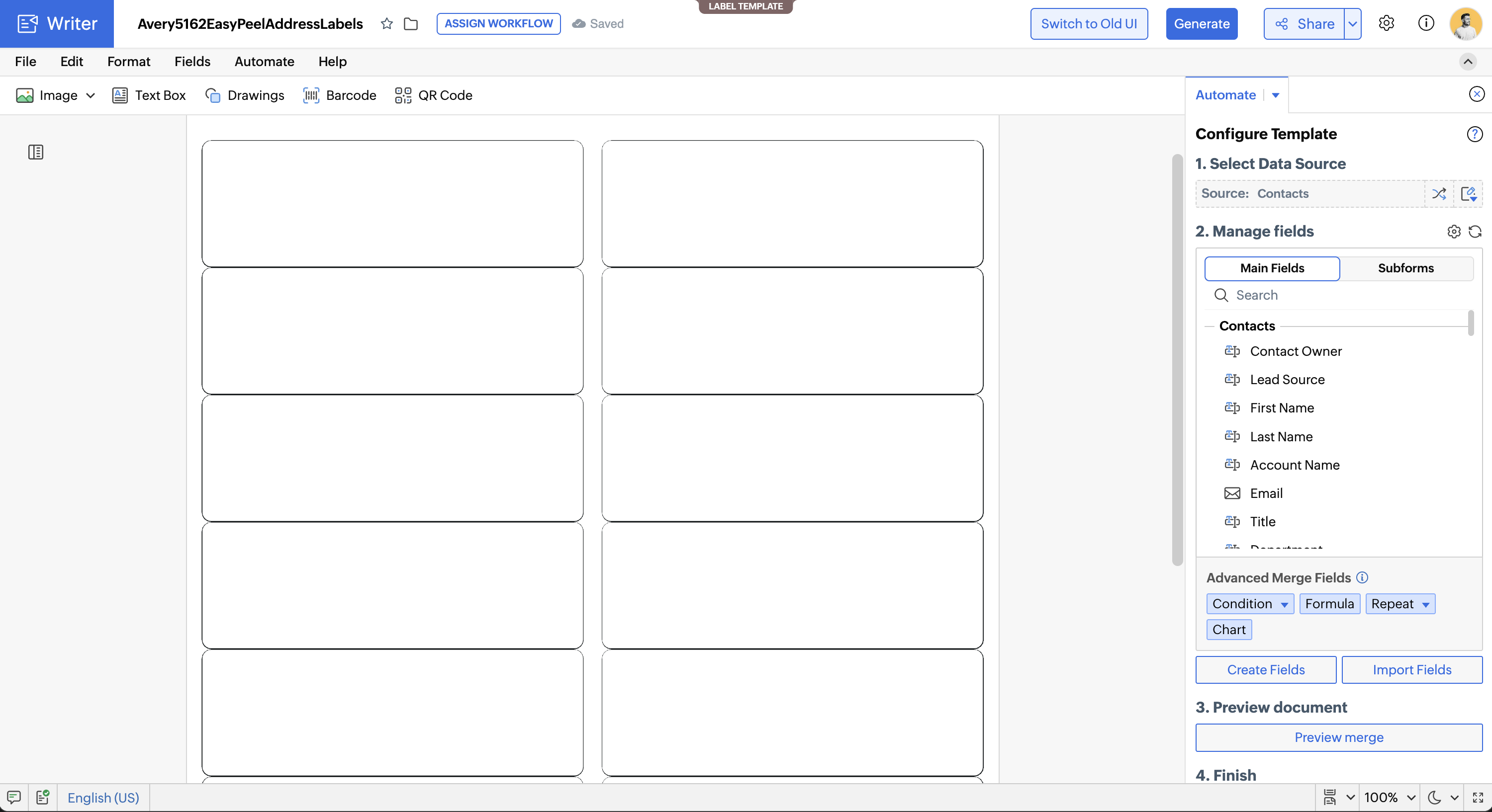 1. A label template will open. Connect your data source and add the relevant fields from the data source to the label template. List of data sources supported in Zoho Writer