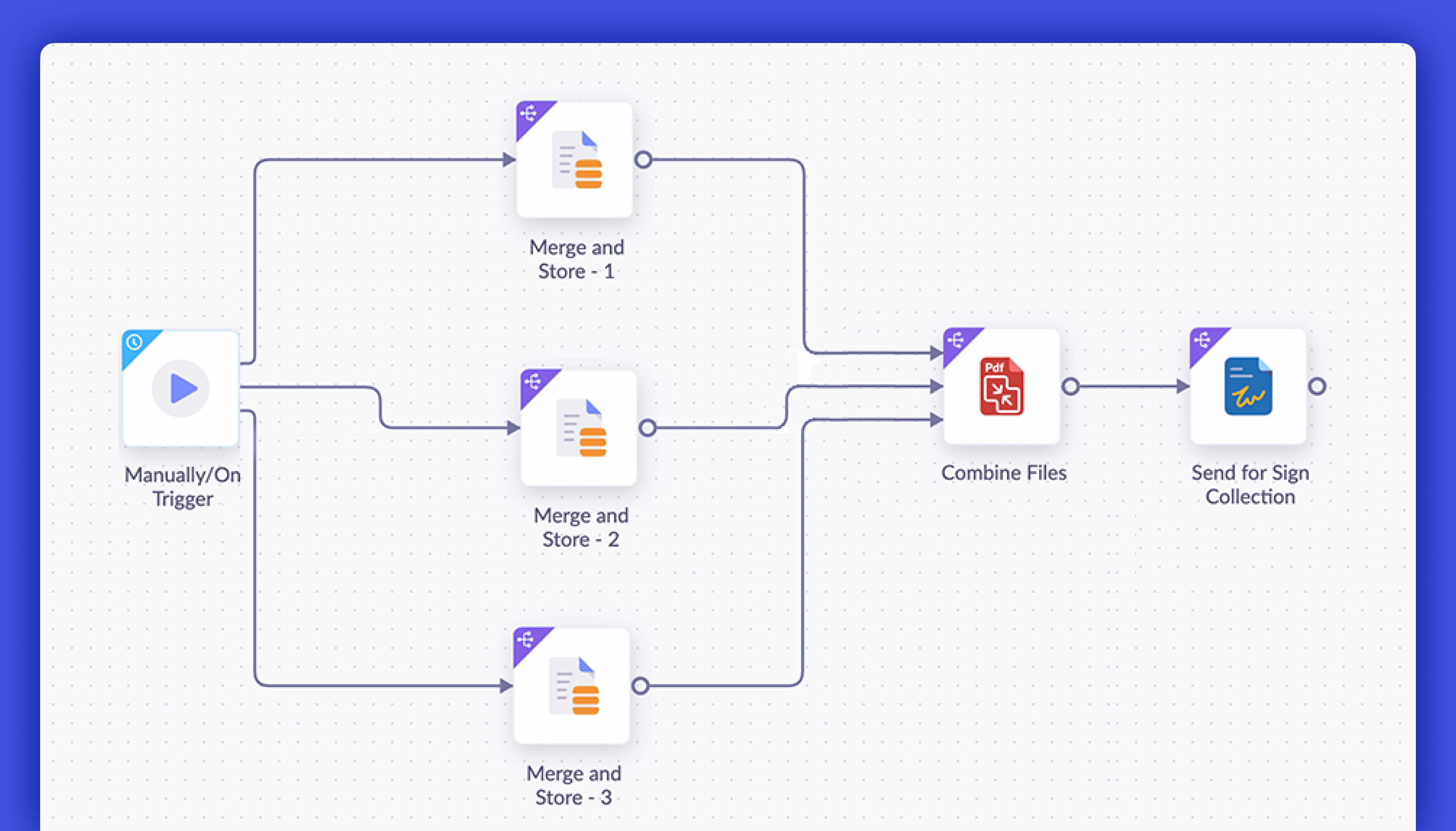 3. Setup your document workflow and choose Combine PDF card to merge the generated PDFs into one or combine the generated PDF with an existing PDF.4. Setup the rest of your workflow (sending an email, storing in Work Drive, etc.)