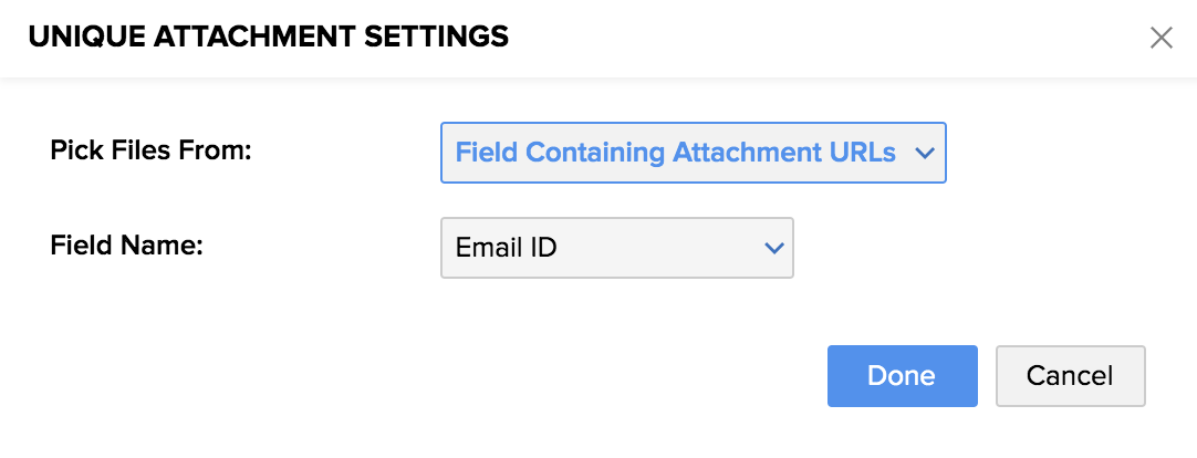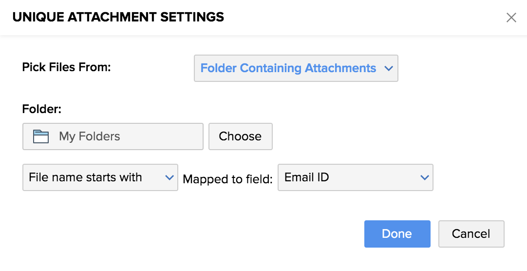 5. Or you can choose pick the folder containing the attachments and then map the attachment file to the field value. Choose the attachment file from the Folder and map it to the associated field name (each value containing a unique name). After you've finished, click Done.