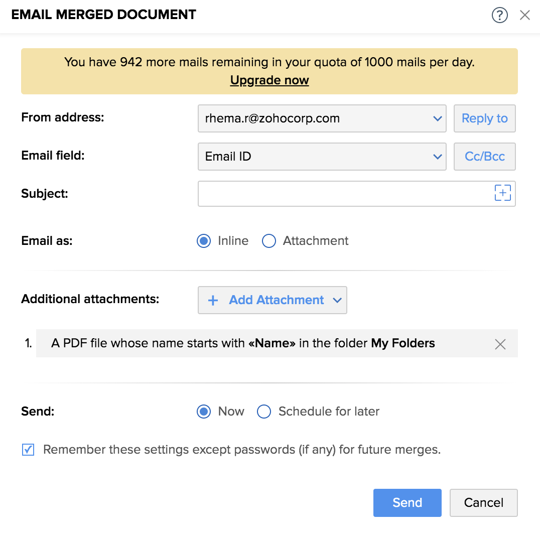 Overview The Merge and Send via Email option in Zoho Writer lets you generate personalized documents for each record in your data source and automatically send them via email. Each recipient gets a customized document as an attachment or inline ...