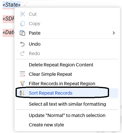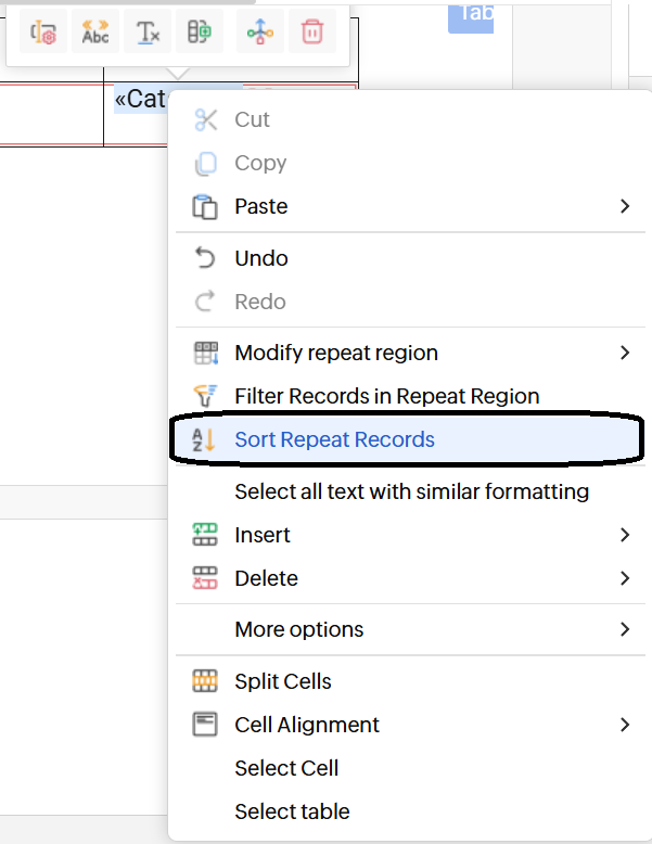 - Right-click on the field by which you intend to sort your repeat data. From the drop-down menu, select Sort Repeat Records.