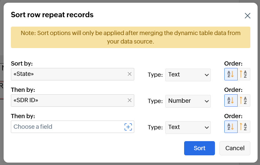 - Click on Sort to initiate the sorting process. Then, preview your merge to ensure that the data is sorted as desired.