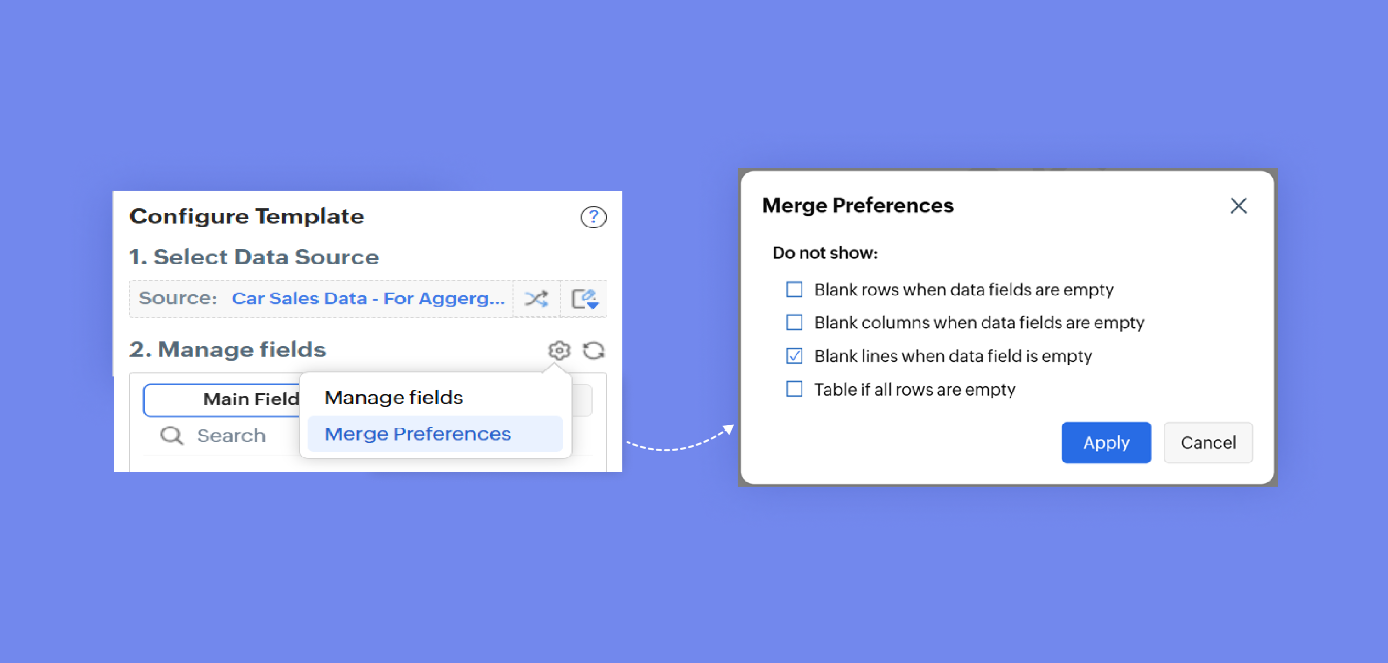 Merge Preferences helps prevent blank lines or placeholders from appearing in the final document when a data field is empty avoiding awkward gaps or broken formatting caused by missing dat or empty value in merge fields. While merging, datasets might contain null values which would add an unwanted blank line or space in the merged document. Merge Preferences help you suppress blank rows, columns, lines and empty tables.