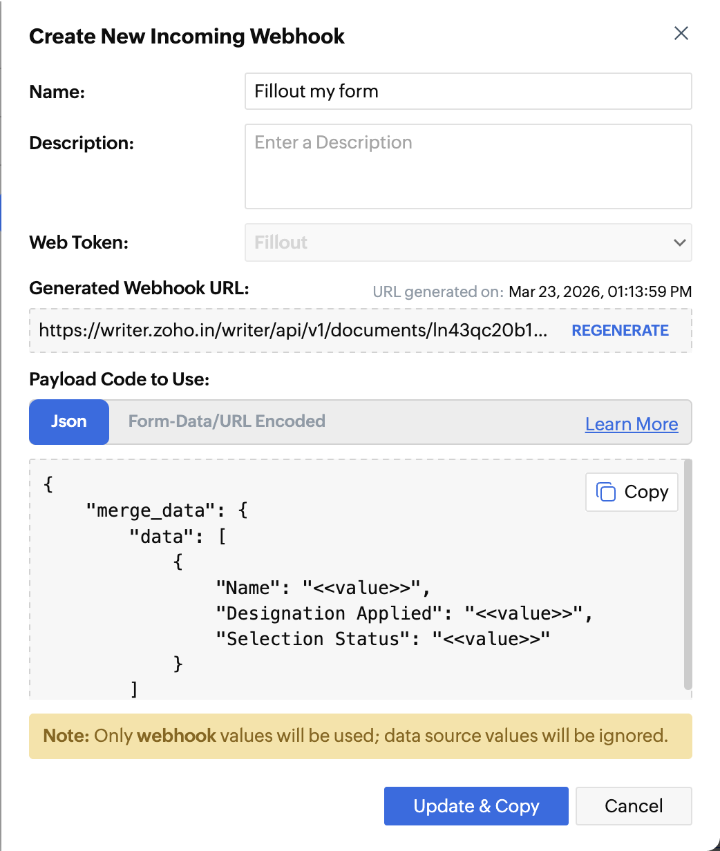 You can now paste this webhook URL into the external application that will send field values to Zoho Writer.