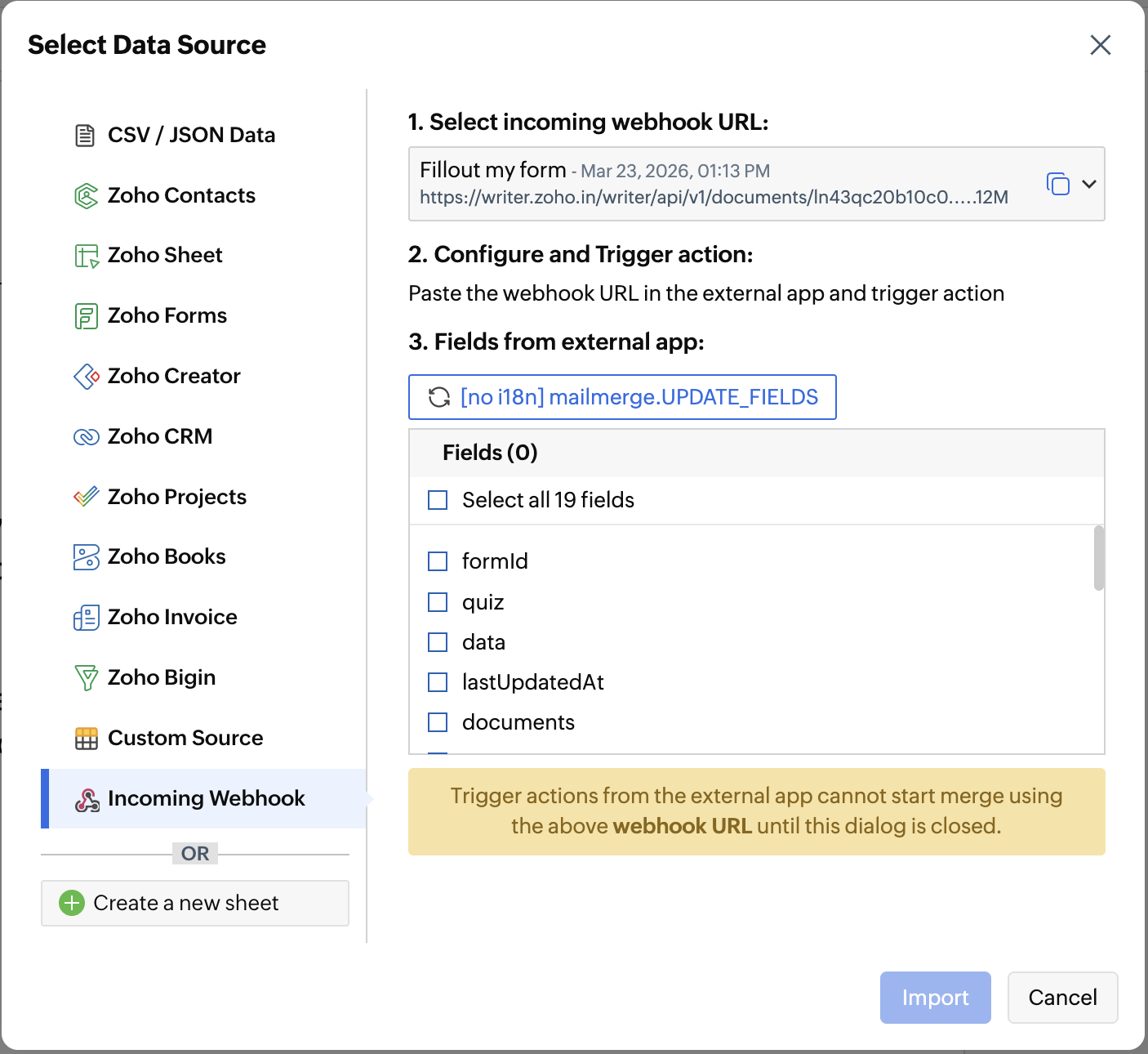 Zoho Writer supports incoming webhooks as a data source to directly receive field values from third-party apps like Fillout, Shopify, or any custom app and use them for document generation, without needing to store the data elsewhere first. This enables you to fetch data in real-time from any app that can send webhook payloads and use it to populate documents instantly.