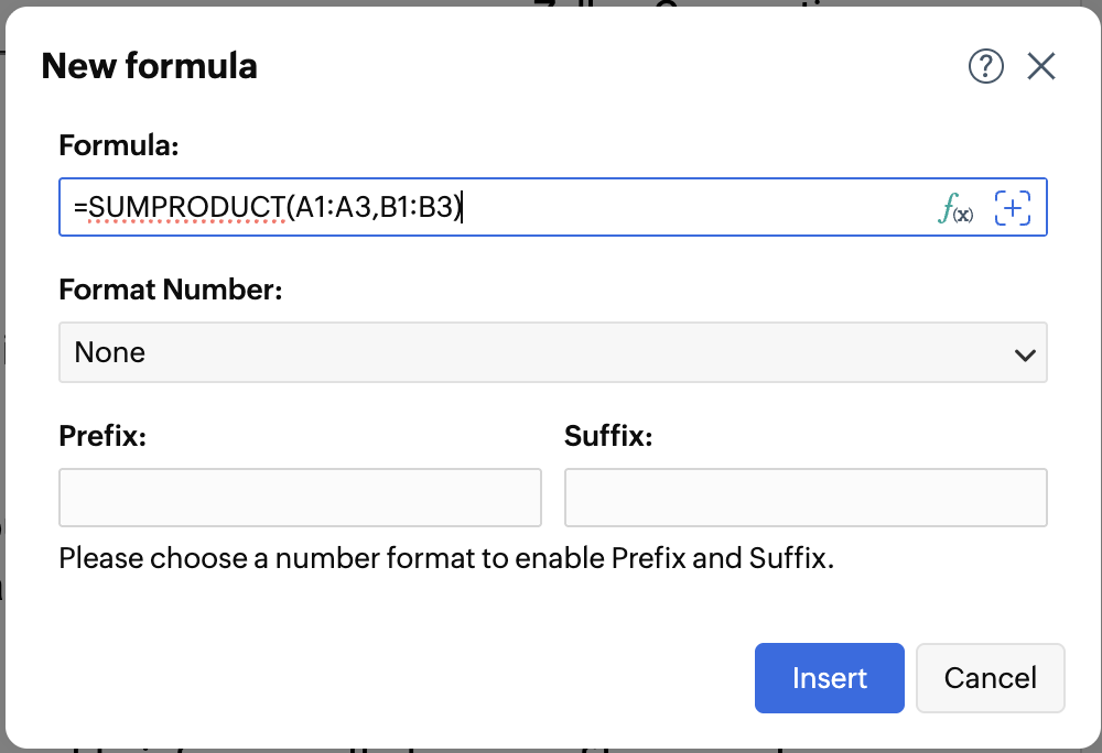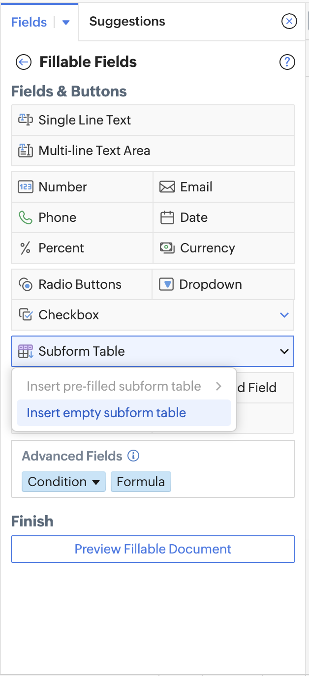 - Click Insert > Fields > Fillable Fields > Formula under Advanced fields. You can also choose formula from the visual cue on the left side of the table.