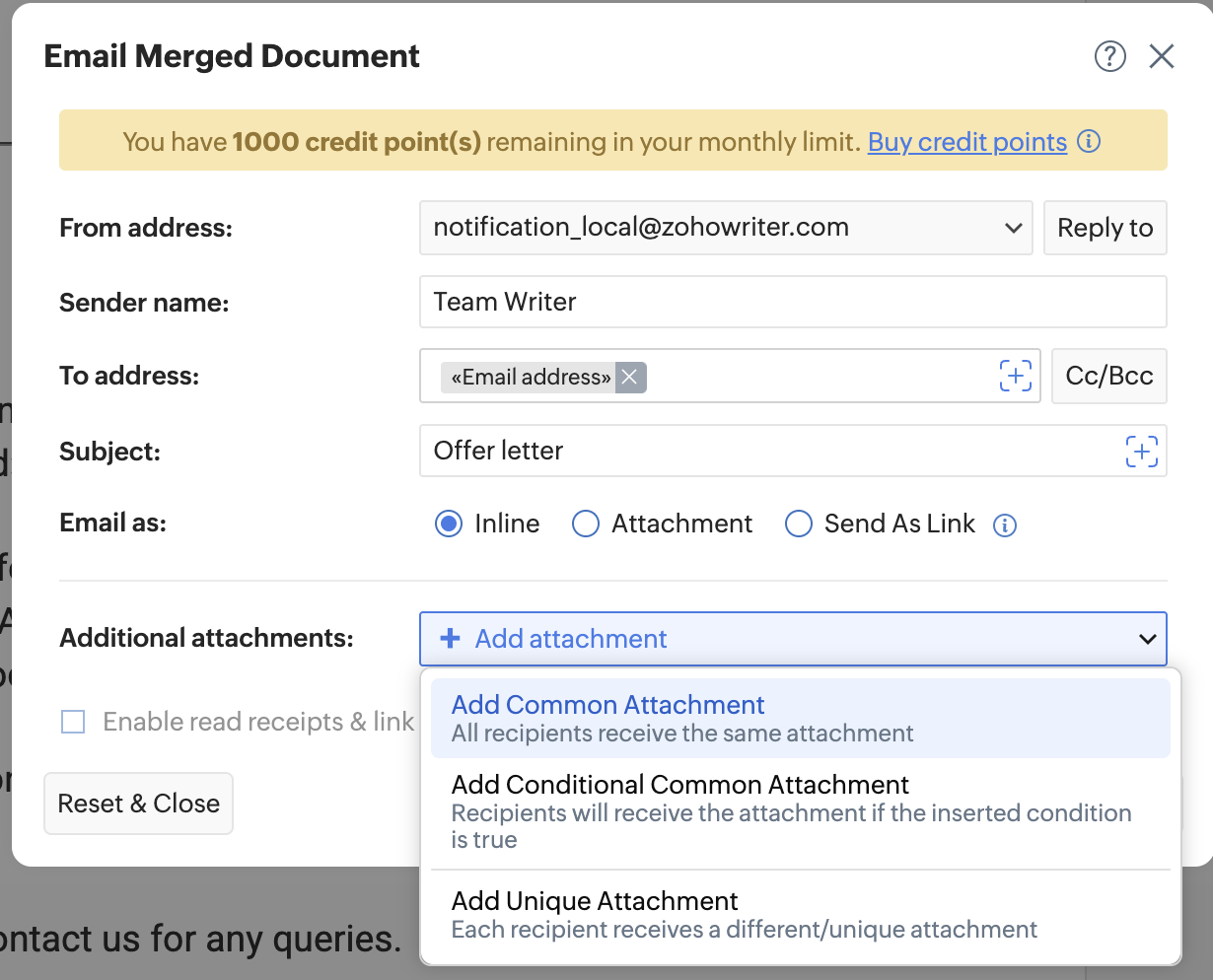 Zoho Writer allows you to add one or more attachments to your mail merge emails. You can add personalized unique attachments using field variables, so each recipient receives a customized file or add common attachments to your mail merge template.