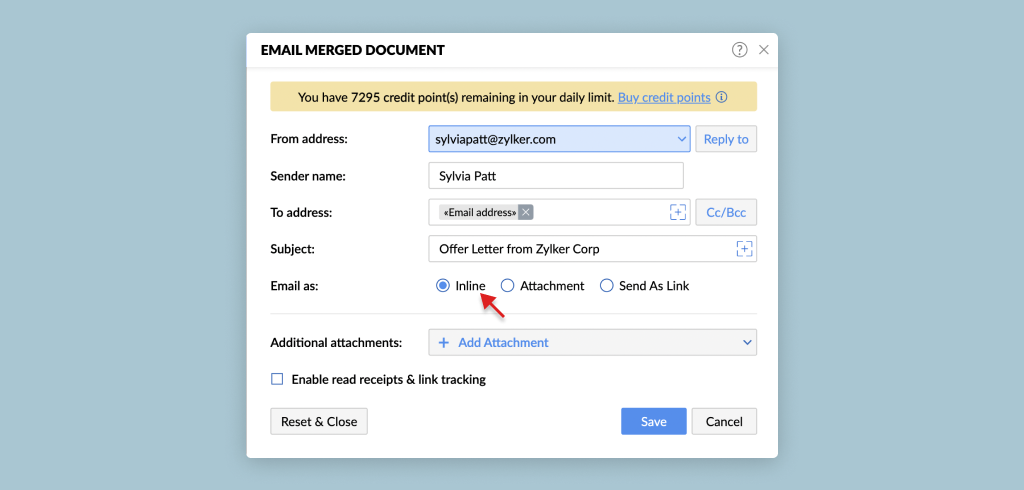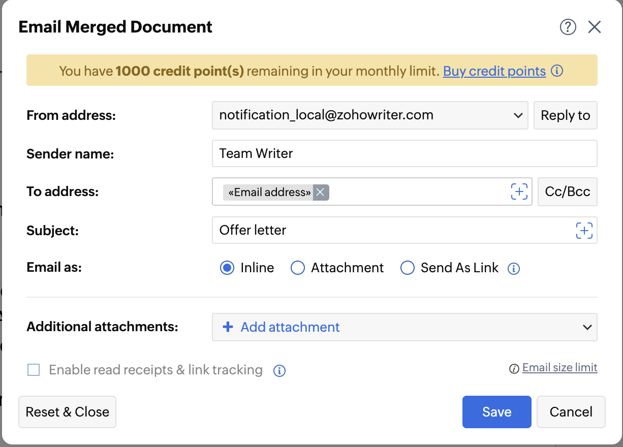 The Merge and Send via Email option in Zoho Writer lets you generate personalized documents for each record in your data source and automatically send them via email. Each recipient gets a customized document as an attachment or inline content or as shared link based on your template and email configuration. You can: